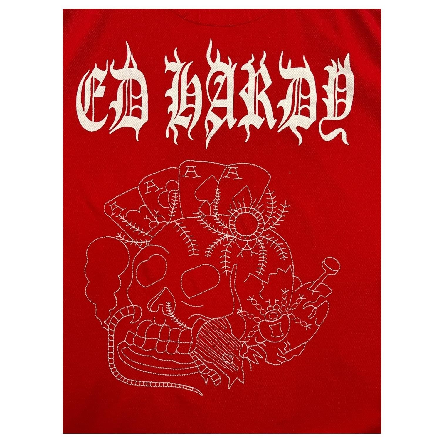 Back details: Large "ED HARDY" gothic script across upper back with oversized stitched skull/aces graphic