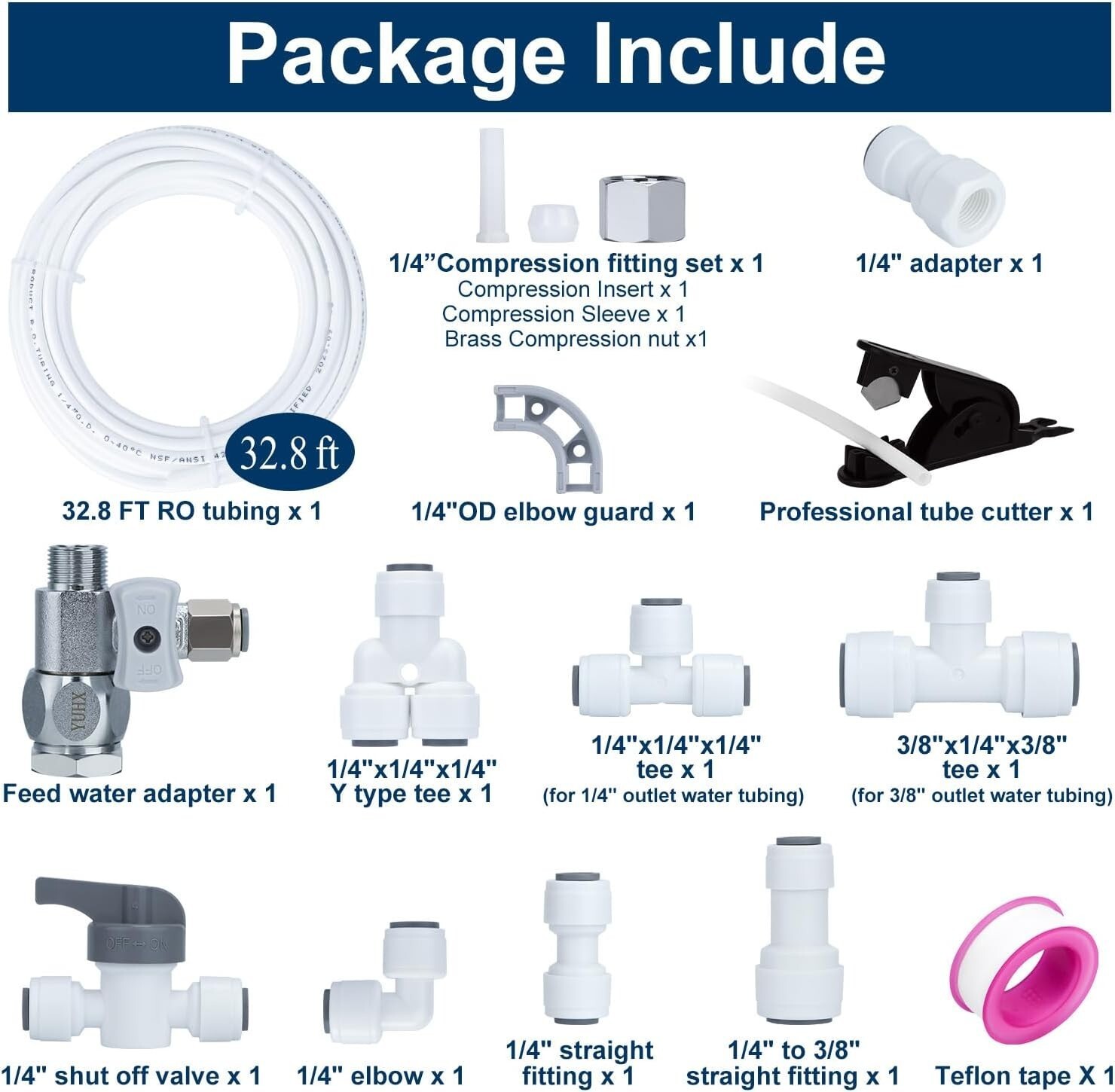 Set Includes: Control Board,feed water adaper x 1,32.8 ft 1/4 water line x 1,professional tube cutter x 1,1/4 shut off valve,3/8 x 1/4 x 3/8 tee x 1,1/4 elbow fitting x 1,1/4 od elbow guard x 1,1/4 compression fitting set x1,1/4 x 1/4 x 1/4 t type tee x 1,1/4 x 1/4 x 1/4 y type tee x 1,1/4 straight fitting x 1,teflon tape x 1