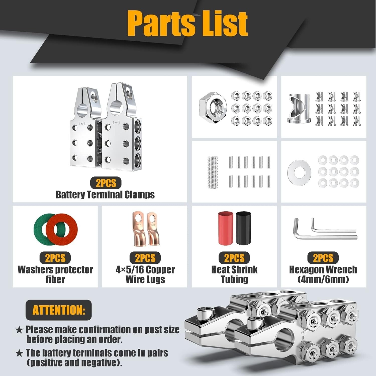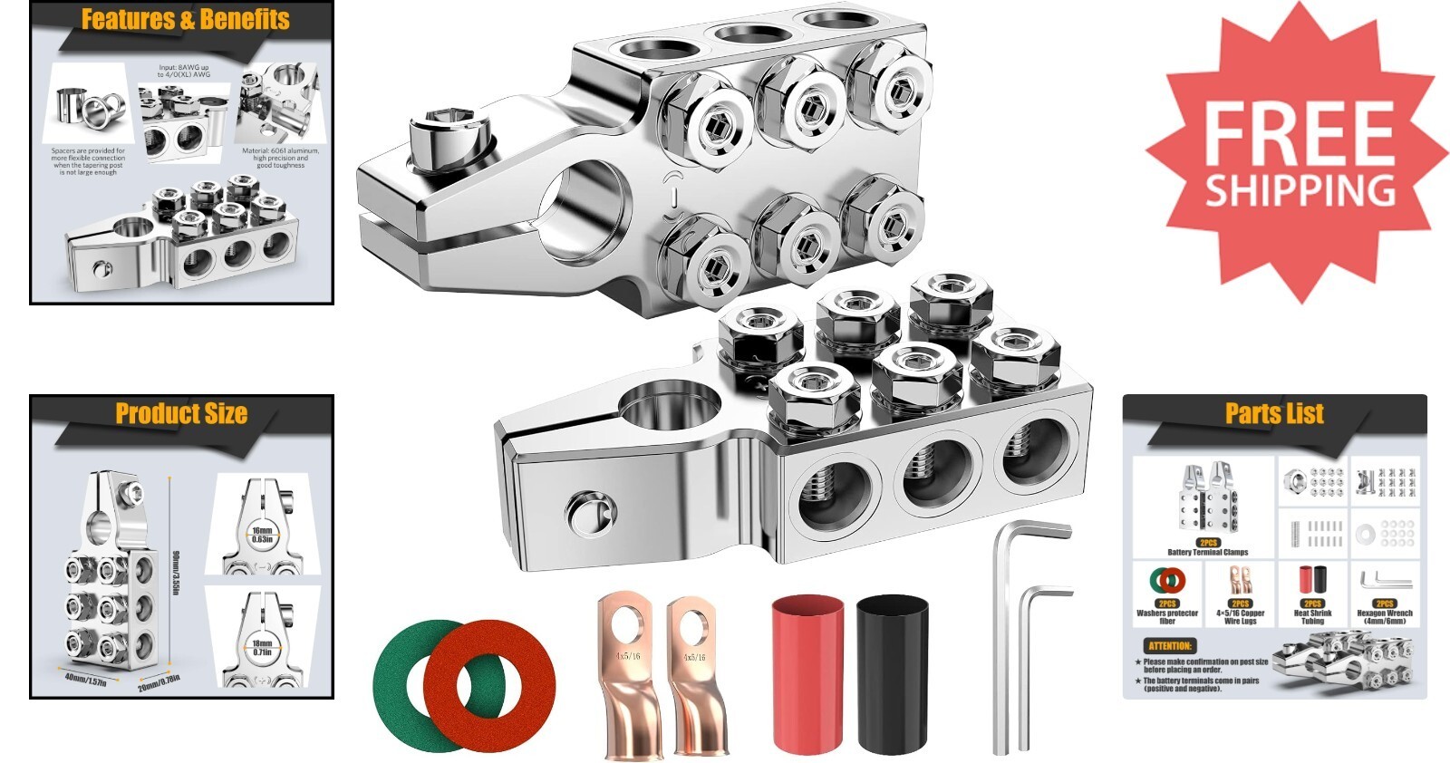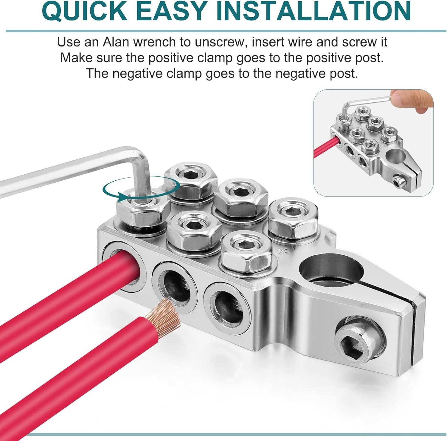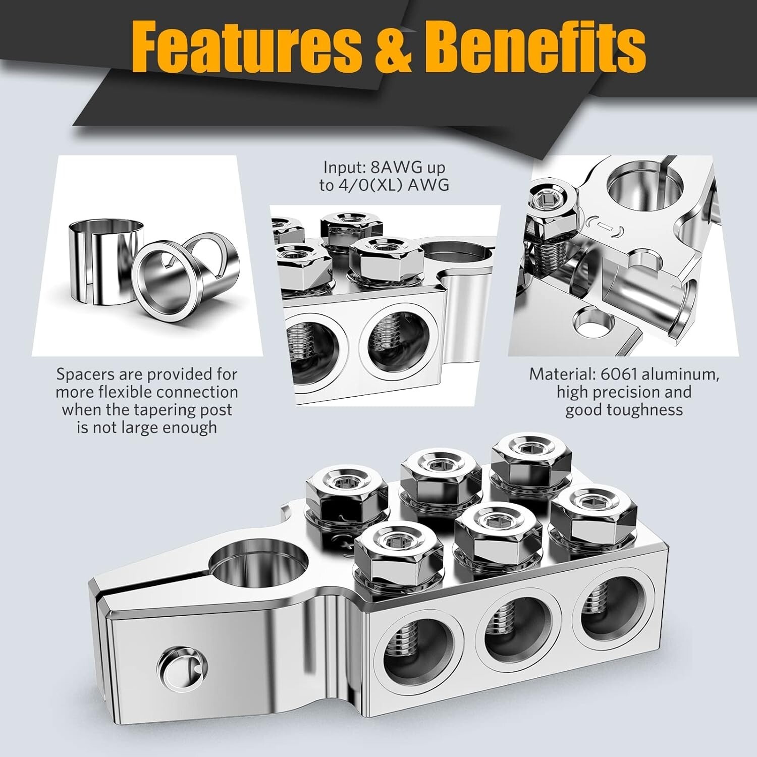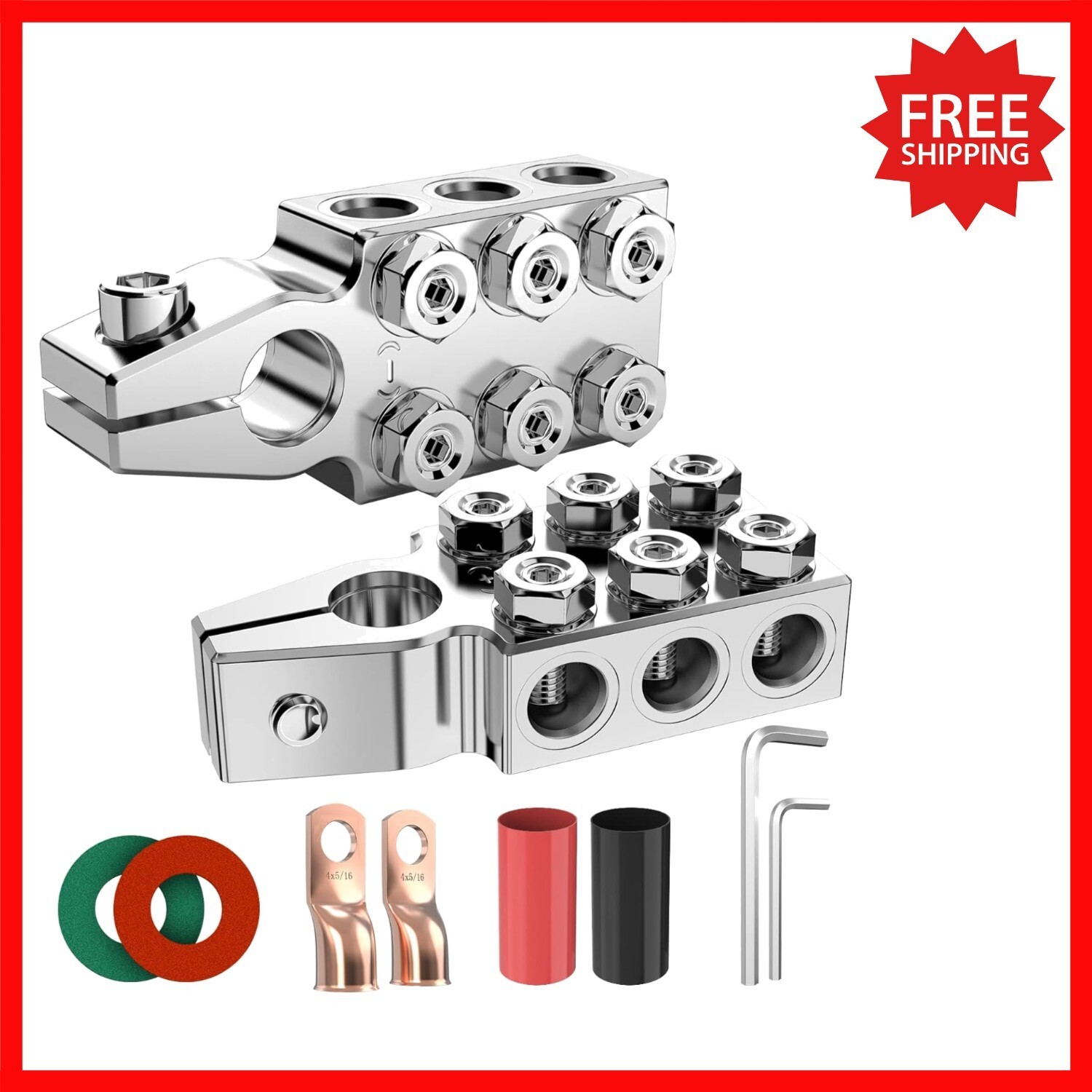 Upgrade your vehicle's electrical system with our Heavy Duty Battery Terminal, crafted from durable 6061 aluminum for high precision and toughness. Designed for easy installation, this 12-way connector features multiple hole-holders and threaded studs, supporting numerous cables simultaneously?perfect for audio systems and additional accessories. Compatible with tapered SAE, DIN, and EN posts (JIS Pencil Post not included) and suitable for various cable sizes from 2/0 AWG to 10 AWG, it fits 6V to 48V systems across cars, RVs, trucks, motorcycles, and more. Includes all necessary tools and components for a secure connection. To ensure fast and reliable delivery, we work with multiple fulfillment partners and suppliers. Depending on availability and location, your order may ship from different warehouses or arrive in packaging that varies from item to item. Tracking details are typically provided shortly after shipment, and customer satisfaction remains our top priority. Please note that due to carrier policies and regional regulations, certain items may not be eligible for delivery to specific states or territories.