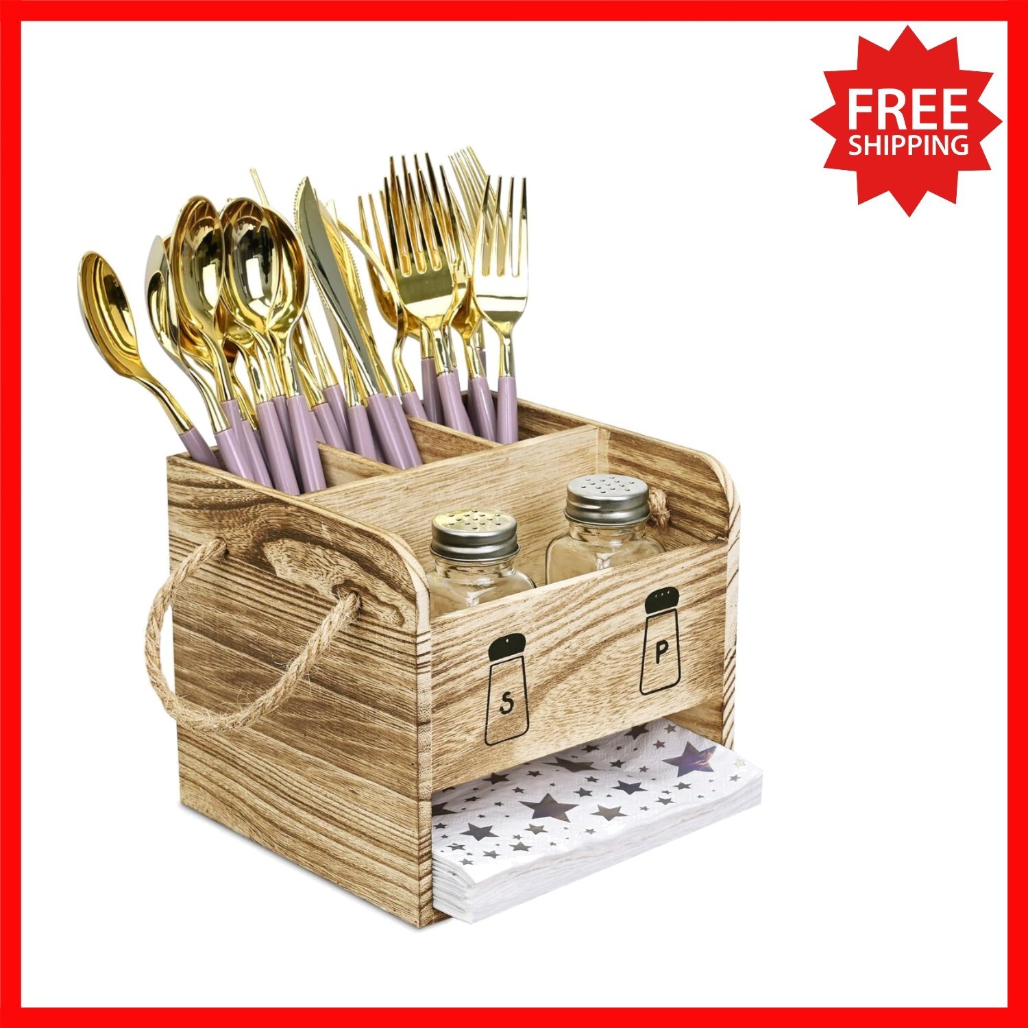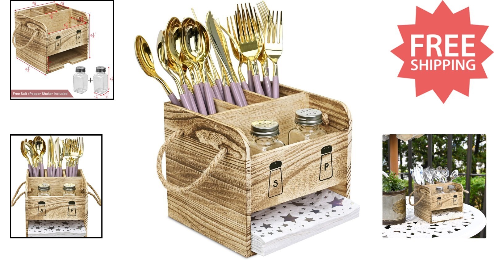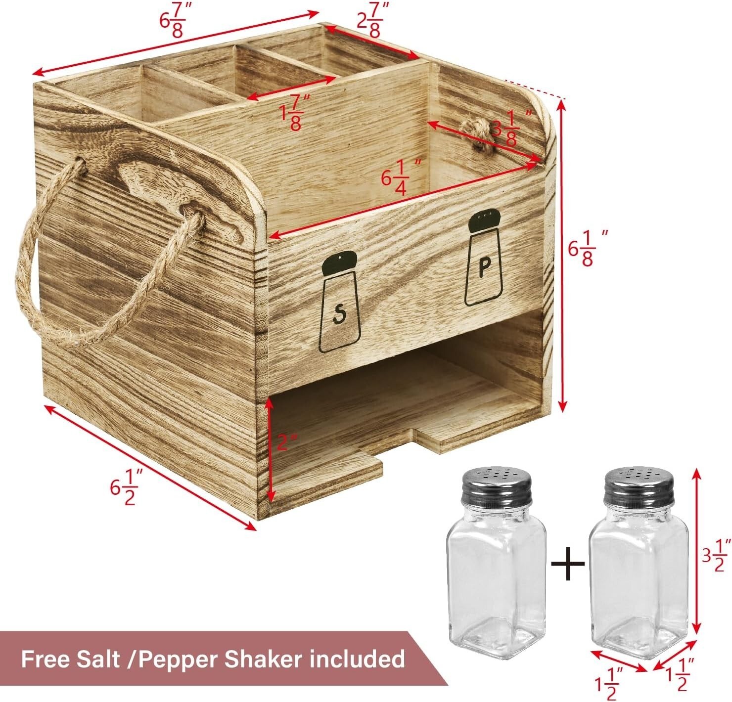Introducing our versatile Napkin and Salt Pepper Holder, crafted from lightweight yet sturdy, non-toxic wood for everyday use. This portable organizer features five spacious compartments: three deep slots for silverware, a front section for salt and pepper shakers, and an accessible space underneath for napkins measuring 6"x 6". The sleek design measures approximately 6.87"W x 6.5"D x 6.13"H, with the included salt and pepper shakers enhancing your table setting. Silverware is not included, and assembly is not required. Perfect for maintaining an organized and stylish dining experience wherever you go. To ensure fast and reliable delivery, we work with multiple fulfillment partners and suppliers. Depending on availability and location, your order may ship from different warehouses or arrive in packaging that varies from item to item. Tracking details are typically provided shortly after shipment, and customer satisfaction remains our top priority. Please note that due to carrier policies and regional regulations, certain items may not be eligible for delivery to specific states or territories.