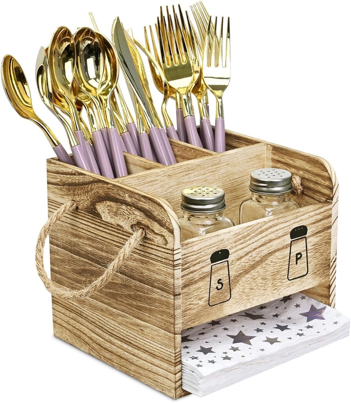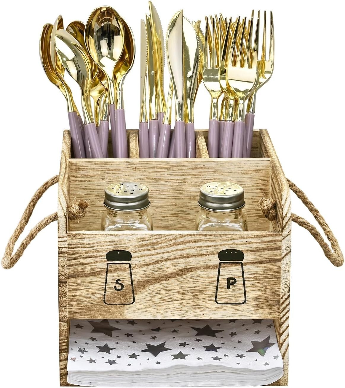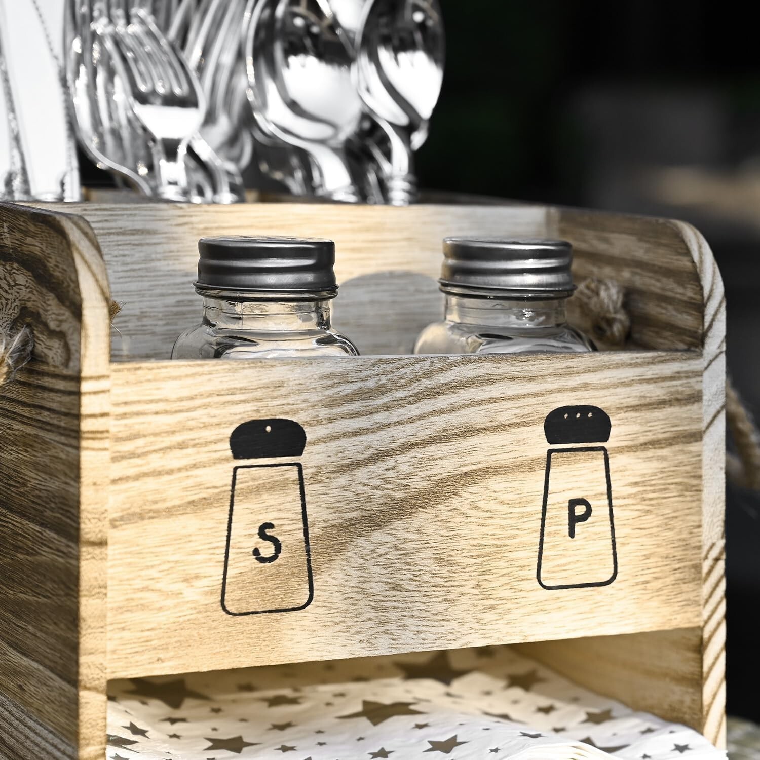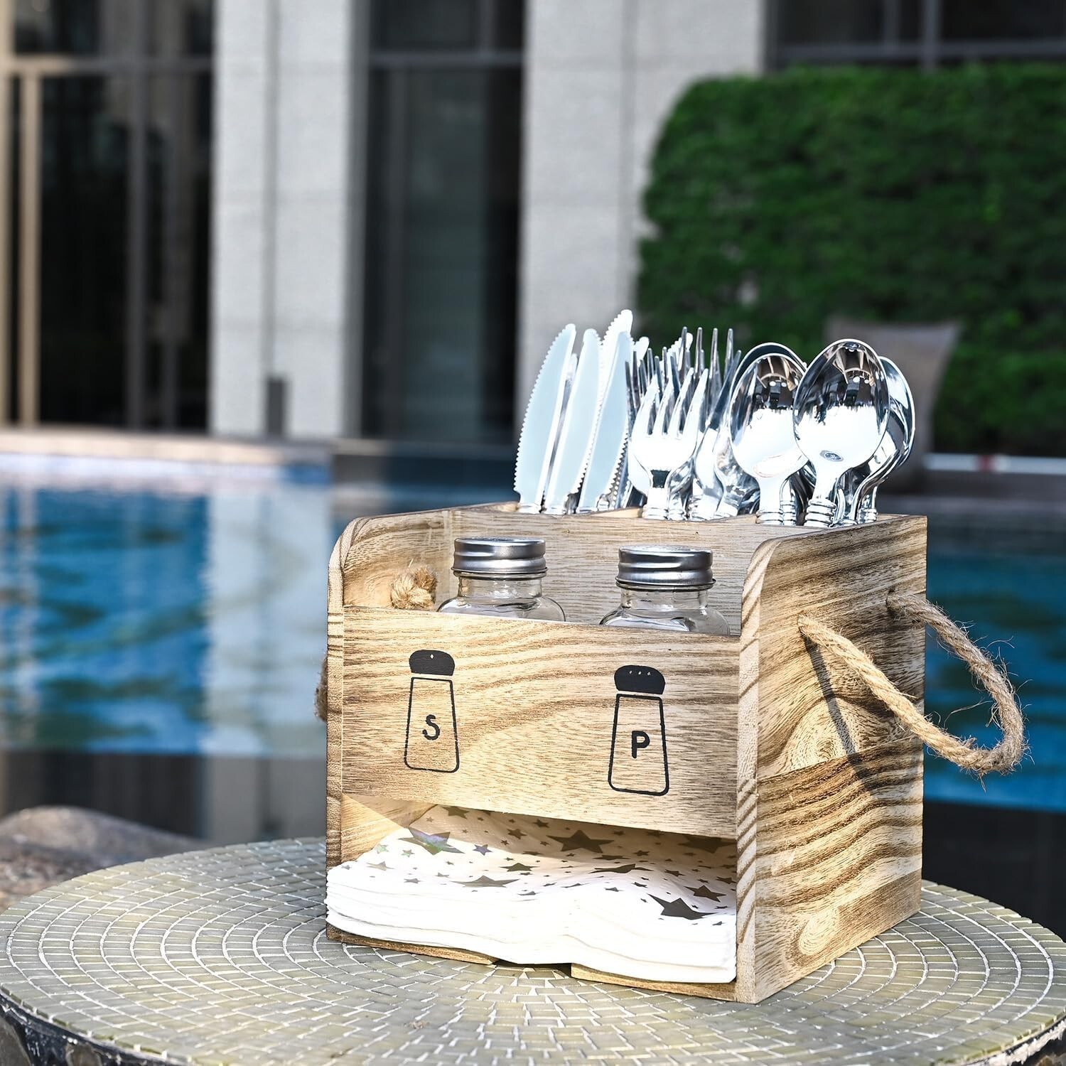 Introducing our versatile Napkin and Salt Pepper Holder, crafted from lightweight yet sturdy, non-toxic wood for everyday use. This portable organizer features five spacious compartments: three deep slots for silverware, a front section for salt and pepper shakers, and an accessible space underneath for napkins measuring 6"x 6". The sleek design measures approximately 6.87"W x 6.5"D x 6.13"H, with the included salt and pepper shakers enhancing your table setting. Silverware is not included, and assembly is not required. Perfect for maintaining an organized and stylish dining experience wherever you go. To ensure fast and reliable delivery, we work with multiple fulfillment partners and suppliers. Depending on availability and location, your order may ship from different warehouses or arrive in packaging that varies from item to item. Tracking details are typically provided shortly after shipment, and customer satisfaction remains our top priority. Please note that due to carrier policies and regional regulations, certain items may not be eligible for delivery to specific states or territories.