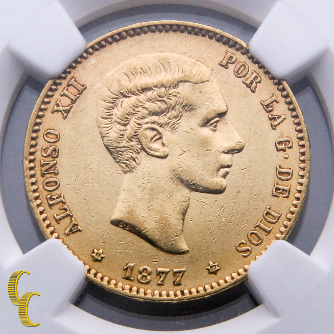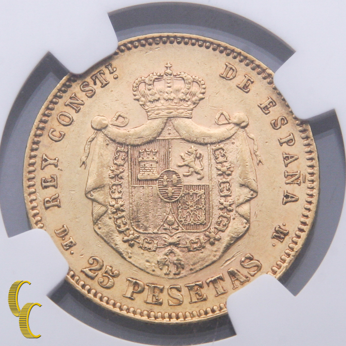 1877 (77) -dem Espagne Or 25 Pesetas Pièce de Monnaie Classé Par NGC Comme Au 55