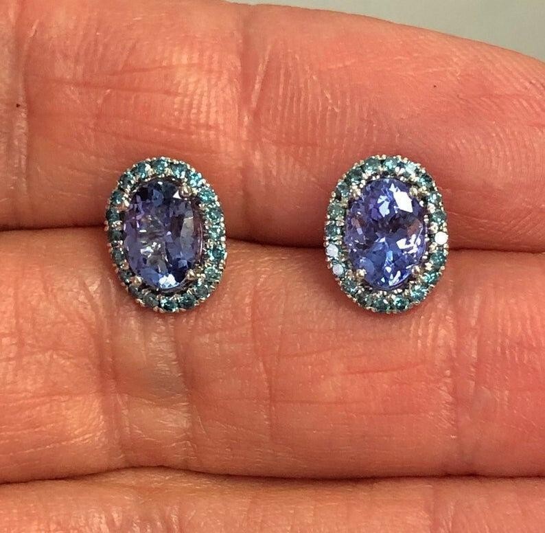 1 Karat Oval Schliff Violett Blau Tansanit Halo Diamant Ohrstecker 14k Weiß Gold