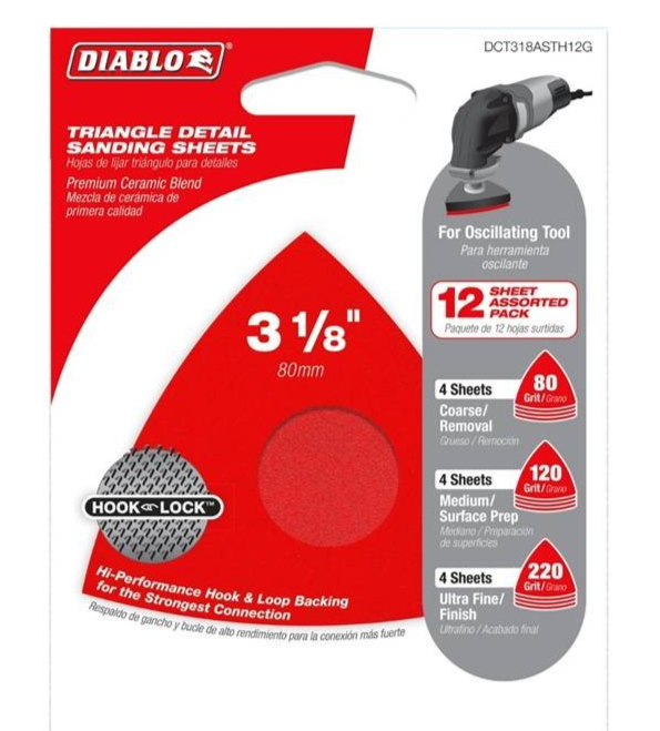 Diablo DCT318ASTH12G 3-1/8'' Triangle Sanding Sheets w/Hook Lock, 12-pcs/Box