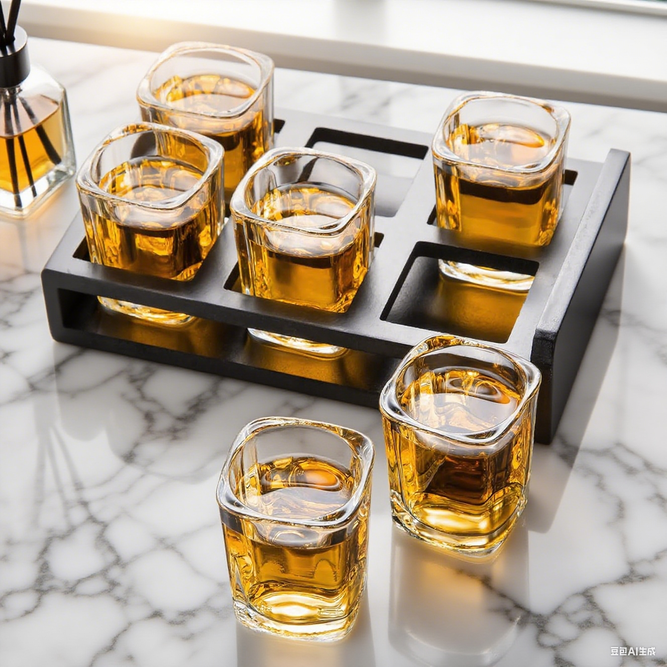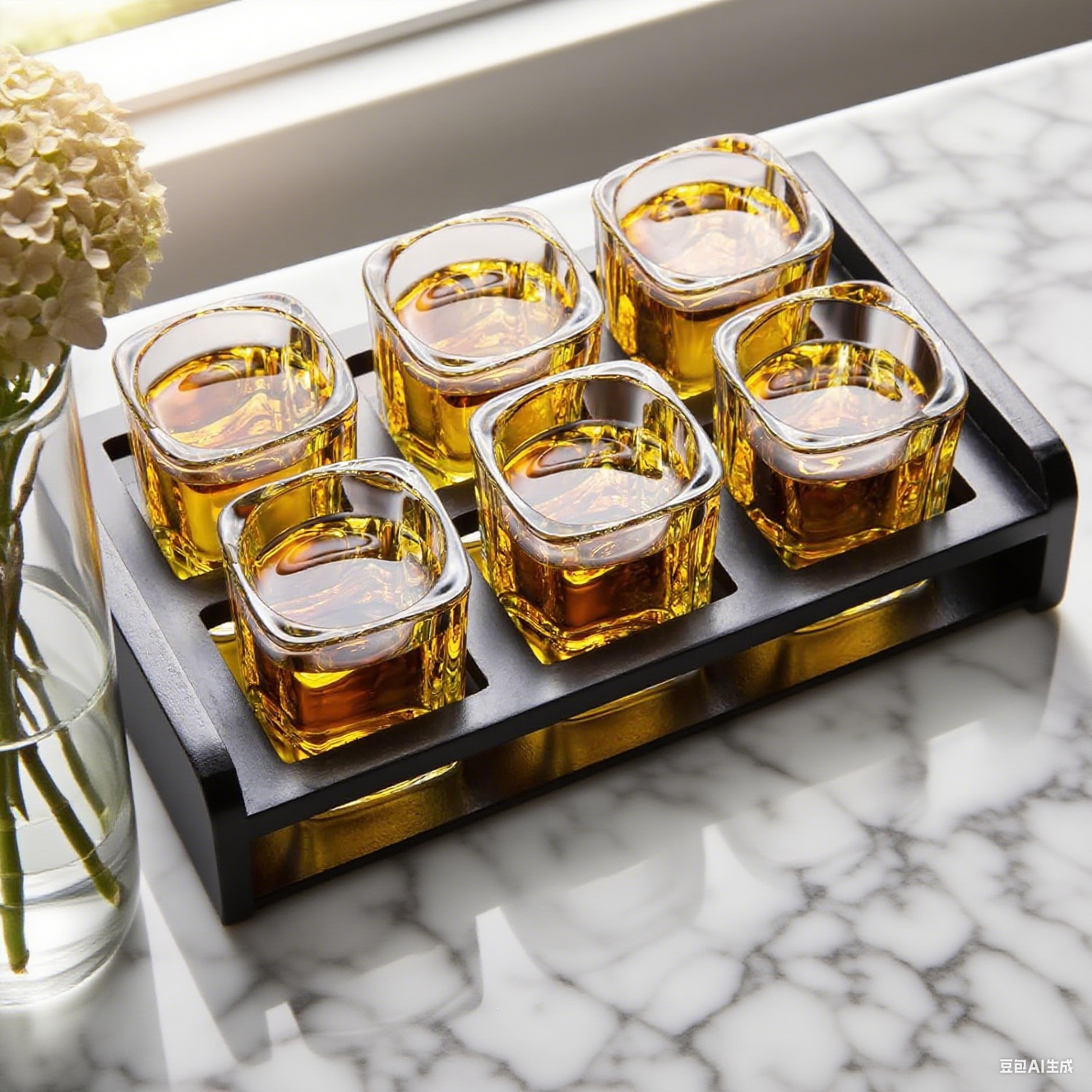 This Square Baijiu cup set features a contemporary style with a square shape and a thickened glass construction. The set includes 6 wine glasses with a capacity of 2 oz each, perfect for enjoying a small wine cup. The set also includes a wooden cup holder for easy storage and display. Made in China, this hand wash only cup set is clear in color and measures 2.4 inches in height and 8.2 inches in width, making it a unique and stylish addition to any home bar or dining table.