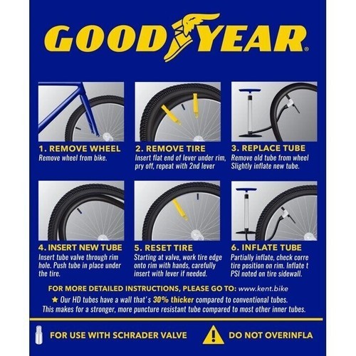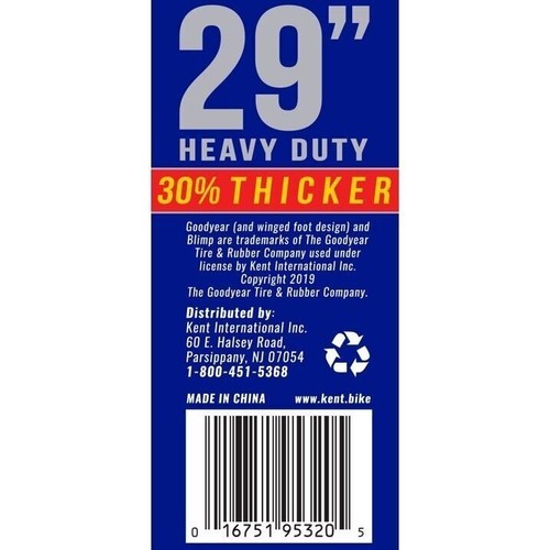 Be more confident about going on a biking adventure with this Goodyear 29" x 1.9" 2.3" heavy-duty tube installed. This model is made of butyl rubber, which provides a smooth ride for every age rider and almost any type of bicycle. These heavy-duty Goodyear tubes are 50% thicker than the conventional types, making them much more puncture-resistant. Whether you're cycling on a paved surface or rough countryside terrain, you can count on these tires to deliver you to your destination with ease. This 95233 bicycle tube is made to fit all 29" bikes with tire widths ranging from 1.9" to 2.3". It features an American or Schrader valve that fits any hand pump or floor pump.
