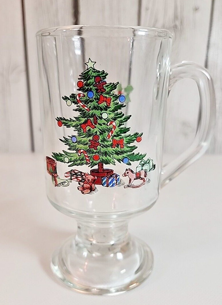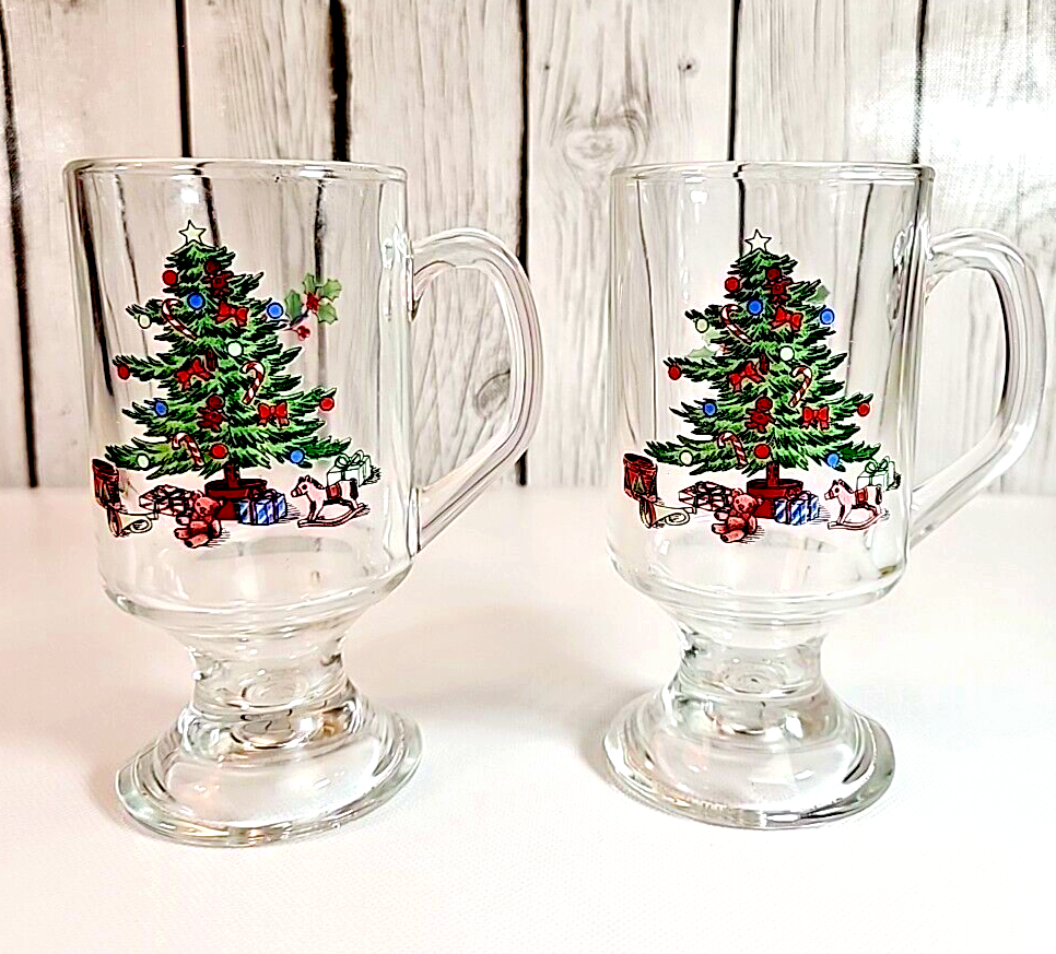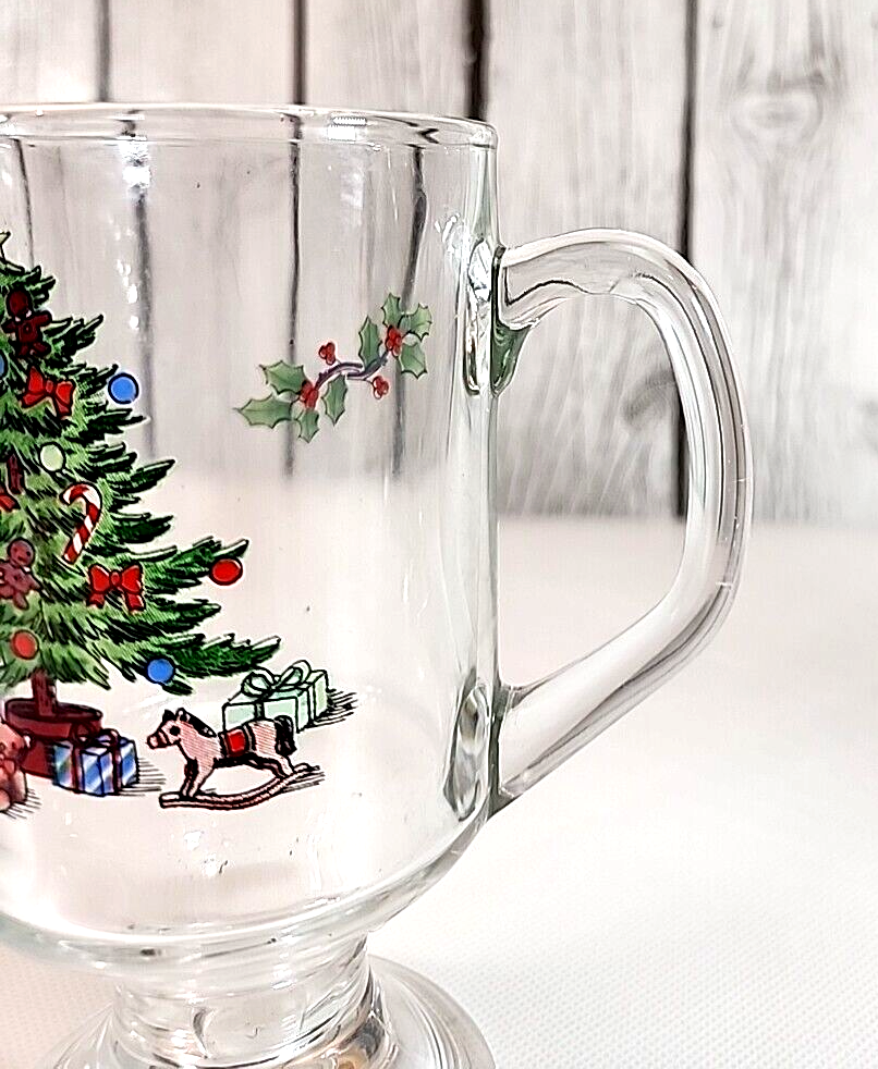 This vintage Luminarc set includes two clear glass mugs featuring festive Christmas trees and holly accents, perfect for serving cocoa or mulled wine during the holidays. A charming choice for holiday entertaining or as a nostalgic hostess gift.