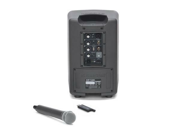 At the core of the XP106 is the included Stage XPD1 USB Digital Wireless System (license free 2.4GHz operating band), which features a wireless receiver built into a USB stick and a handheld dynamic microphone transmitter with Samson's Q6 mic capsule. With a 100' operating range (environment dependent), the Stage XPD1 frees presenters and performers from the constraints of cables when using the XP106w. Combining the Stage XPD1 with the PA's 20 hours of battery life and Bluetooth connectivity makes the XP106w a completely wireless portable PA solution.