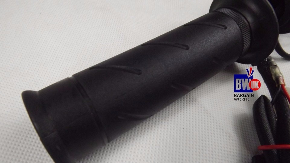 A PAIR OF MOTORCYCLE HEATED GRIPS A 5 SETTING HEAT CONTROL PANEL VERY EASY TO FIT - TAKES 5 MINUTES GREAT GRIP SUPPORT, FEELS COMFORTABLE SUITABLE FOR ALL MOTORCYCLES WITH HANDLE BAR MEASUREMENTS OF: LEFT INSERT DIAMETER IS 22MM RIGHT INSERT THROTTLE DIAMETER IS 25MM EASY TO USE AND HEATS UP VERY QUICKLY 5 TEMPERATURE SETTINGS TO MEET YOUR EXACT NEEDS WARMS UP VERY QUICKLY 12V PER PAIR APPROX 3.0 AMPS WATER PROOF AND VERY LONG LASTING