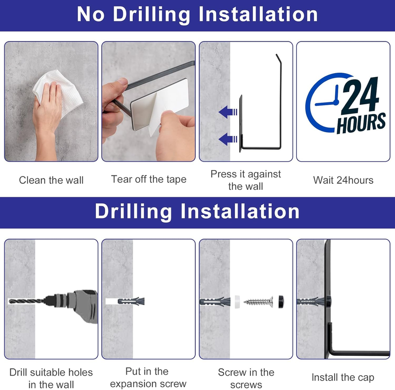 TWO MOUNTING OPTIONS: We are equipped with adhesive tape and several screw accessories for your use. 1.After applying adhesive backing on the back peel the adhesive backing and place it vertically or horizontally on any smooth surface?no drilling needed. 2.Measure the pitch and drill the holes,Use hammer to put the expansion screws into holes,Tighten the inner screw with the screwdriver,Cover the screw cap.