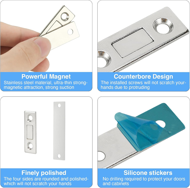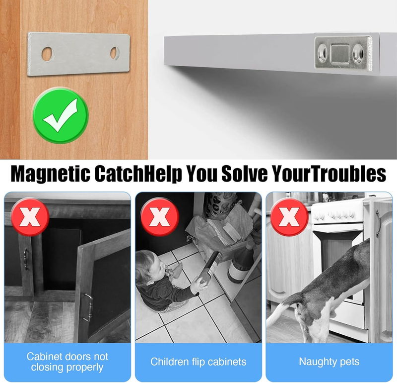 ?Ultra Thin Design:Although the thickness is only 1/10", the magnetic force is very strong, which can make the magnetic drawer latch as close as possible to the cabinet, drawer, etc., and is enough to ensure the strong magnetic force