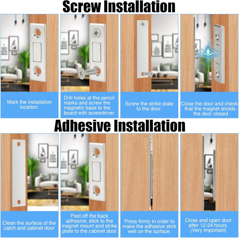 ?Easy installation:You can use screws and free double-sided tape to install the magnetic drawer latch, please wait 2 hours after applying double-sided tape before closing and opening the door, so that the adhesive adheres well to this surface.