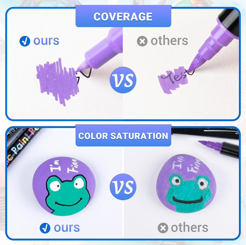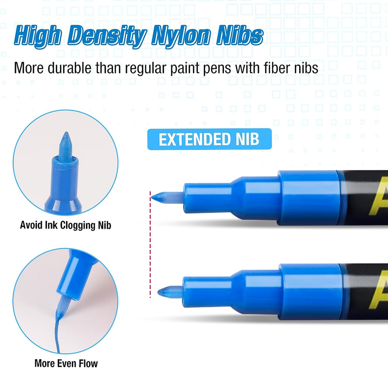 Easy to Control Non-bleeding: Our fine tip paint pens with 0.7mm extra fine point nylon tip. These paint marker pens features smooth flow, quick-drying, weather resistant, high quality certificated ink, environmental friendly and conforms to ASTM D-4236 EN71-3 certificate. The acrylic markers paint pens perfect for drawing, painting and detailing