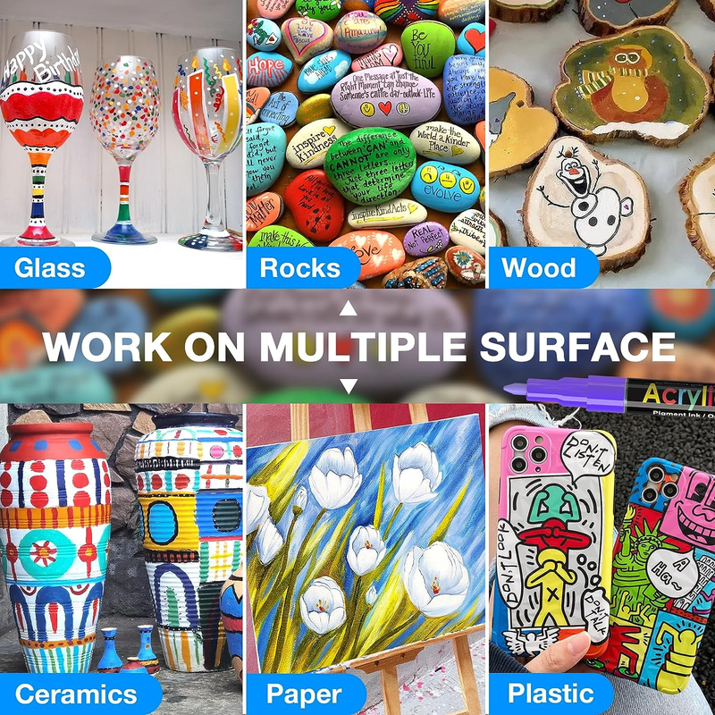 Work on Multiple Surface: Whether you are kids, students, artists, teenagers or adults, you'll have fun with these fine tip acrylic paint pens. These paint markers for crafts can be used on rocks painting, wood painting, Halloween pumpkin painting,body face painting, DIY Easter eggs, Christmas ornaments, scrapbooking making, gift cards making. And these paint markers will be a great gift idea for Christmas, Birthday, Mother's Day, Easter Day, Valentine's Day, Thanksgiving, New Year's gift