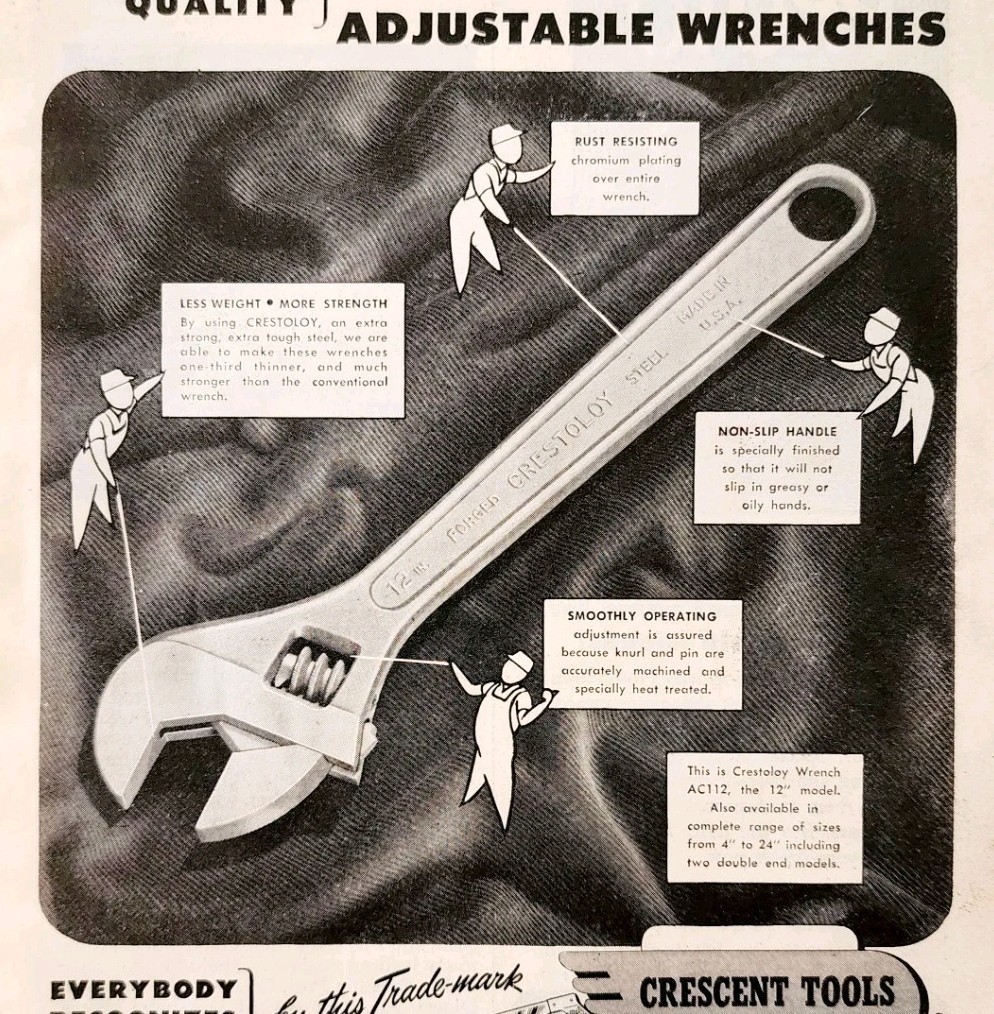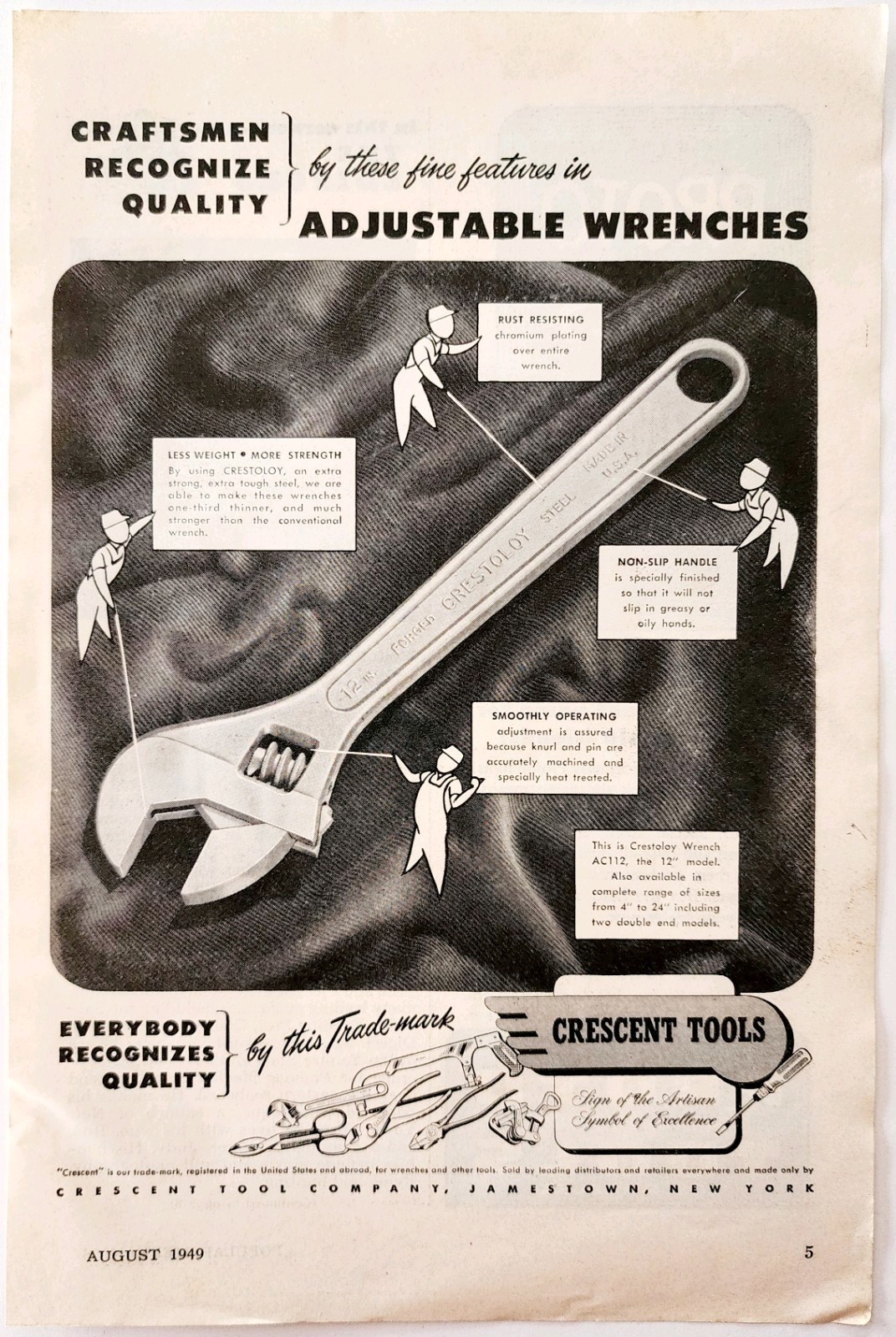 1949 Crescent Tools Adjustable Wrench Advertisement Crestoloy Steel Vintage E8P