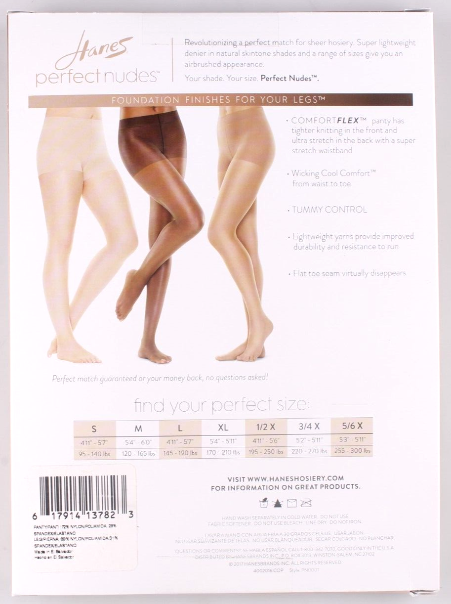 This is for a brand new pair of Hanes Perfect Nudes? Tummy Control Hosiery Bronze/Nude 6 M Women's (First pick is for size Small but this listing is for a Medium) Product details Hosiery that matches your skin perfectly. These lightweight pantyhose have a moderate control top, sheer legs and moisture wicking tech. Made of nylon and spandex. ComfortFlex panty has tighter knitting in the front, ultra stretch in back and a super stretch waistband. Moderate control band around top edge to help smooth out muffin top. Cool Comfort moisture wicking technology. Lightweight yarns provide improved durability and run resistance. Sewn-in cotton crotch gusset. Sandalfoot toe seams.