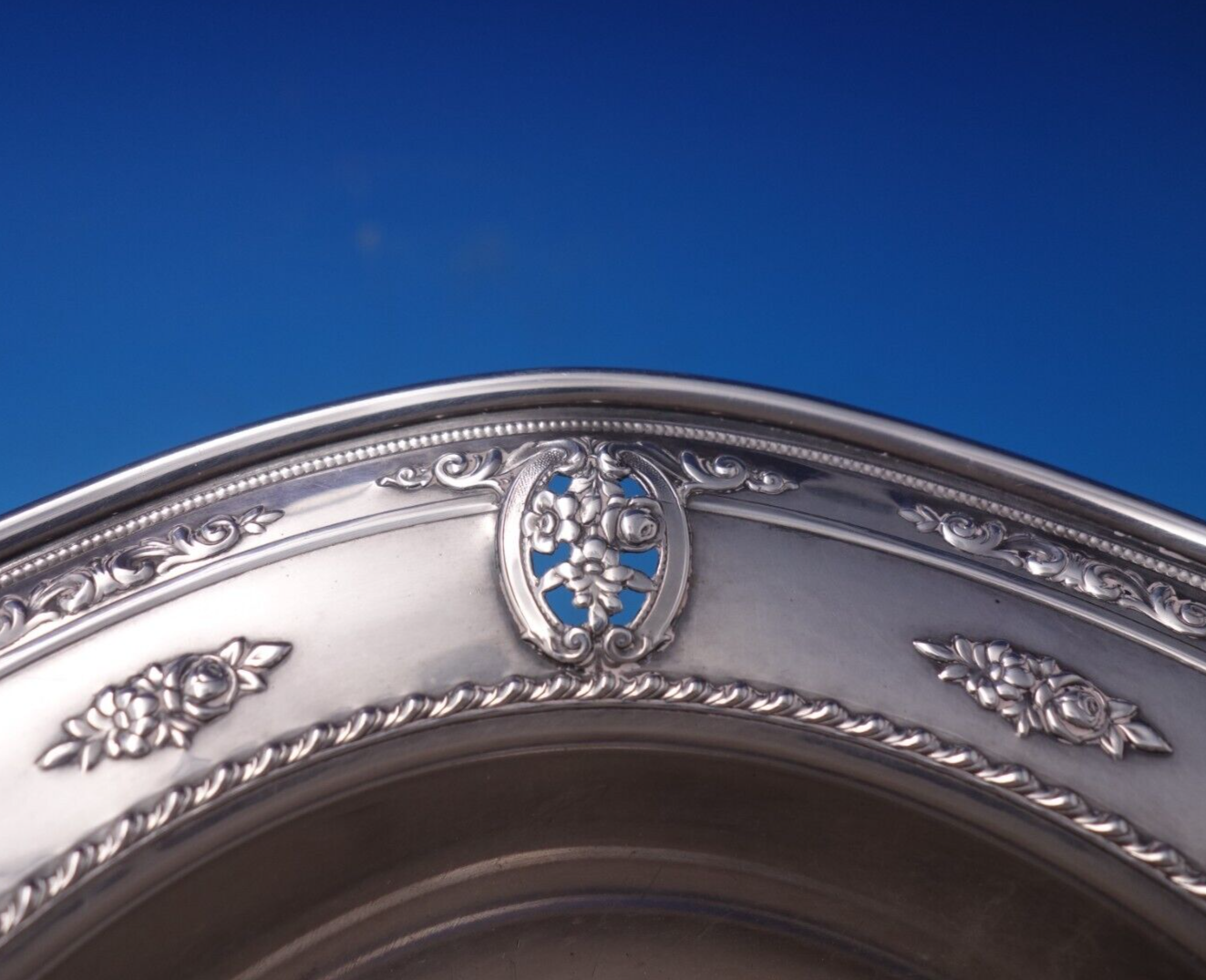Superb Rose Point by Wallace sterling silver bon bon bowl / wine coaster marked #4600-9. This piece measures 1 1/4" tall x 6 1/2" and weighs 4 troy ounces. It is not monogrammed and is in good vintage condition as shown in the photos. Terrific!