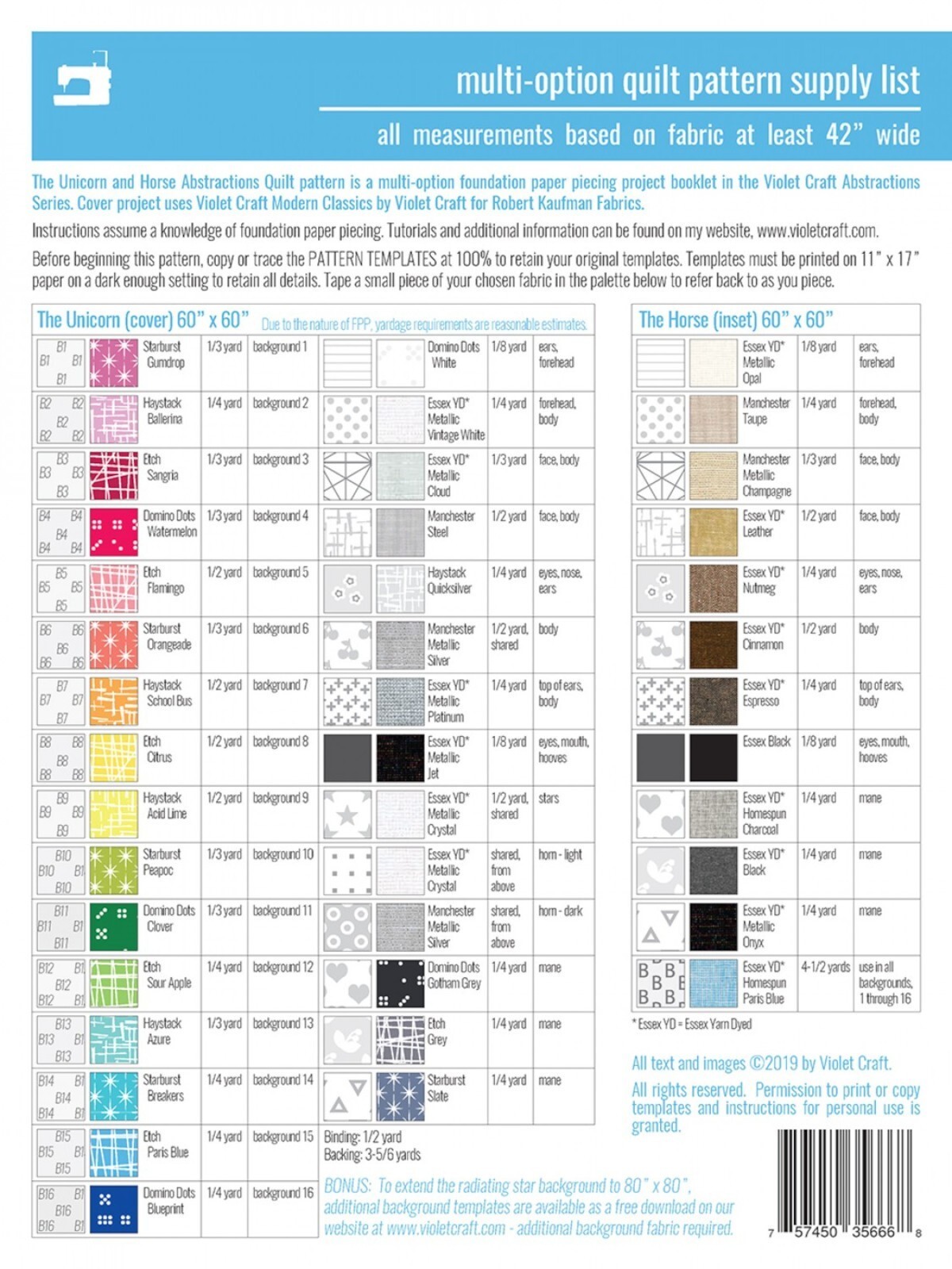 The Unicorn and Horse Abstractions Quilt Foundation Paper Piecing Quilt Pattern. The Unicorn and Horse Abstractions Quilt pattern is a multi-option foundation paper piecing project booklet in the Violet Craft Abstractions Series. This pattern includes directions to make either a Unicorn or a Horse. Also included are the instructions for a solid background or a color-filled background that radiates out from the unicorn/horse. The paper-pieced Stars can also be removed from the background if you so chose. So many choices in one dreamy pattern. Cover project uses Violet Craft Modern Classics by Violet Craft for Robert Kaufman Fabrics. CHK-VC035