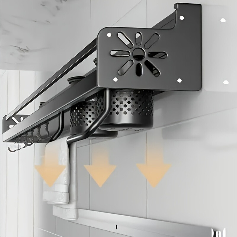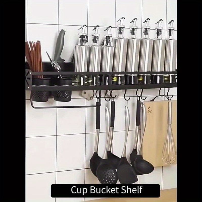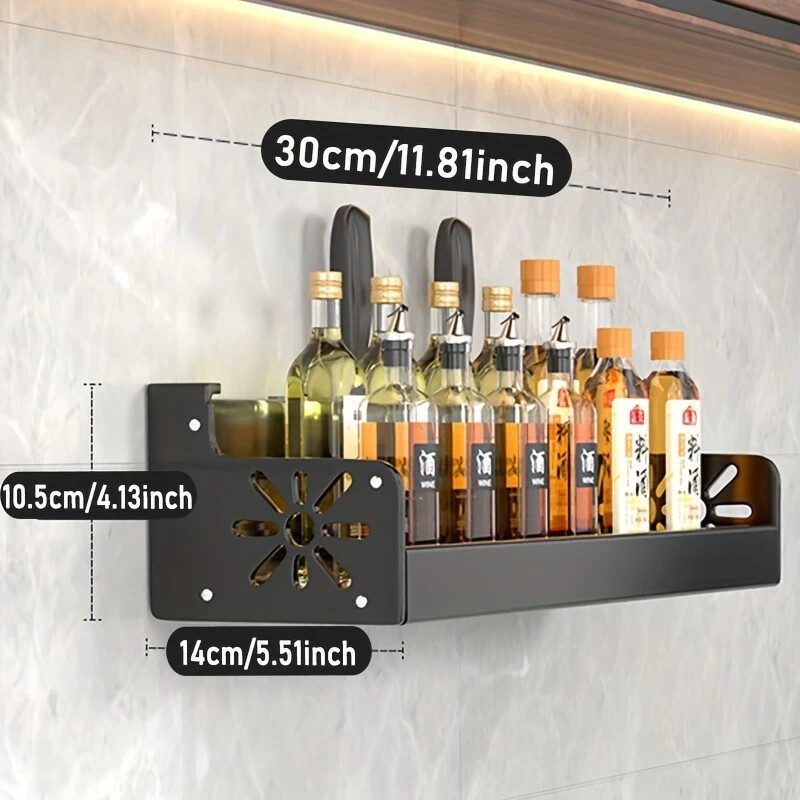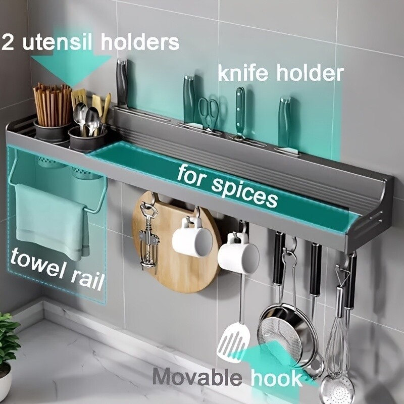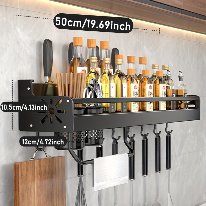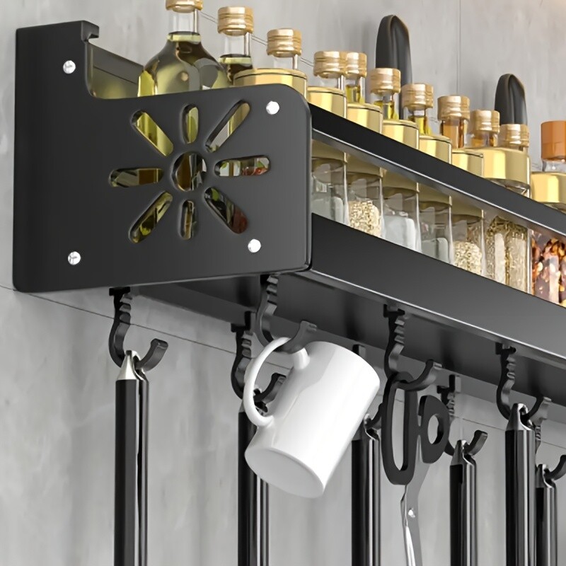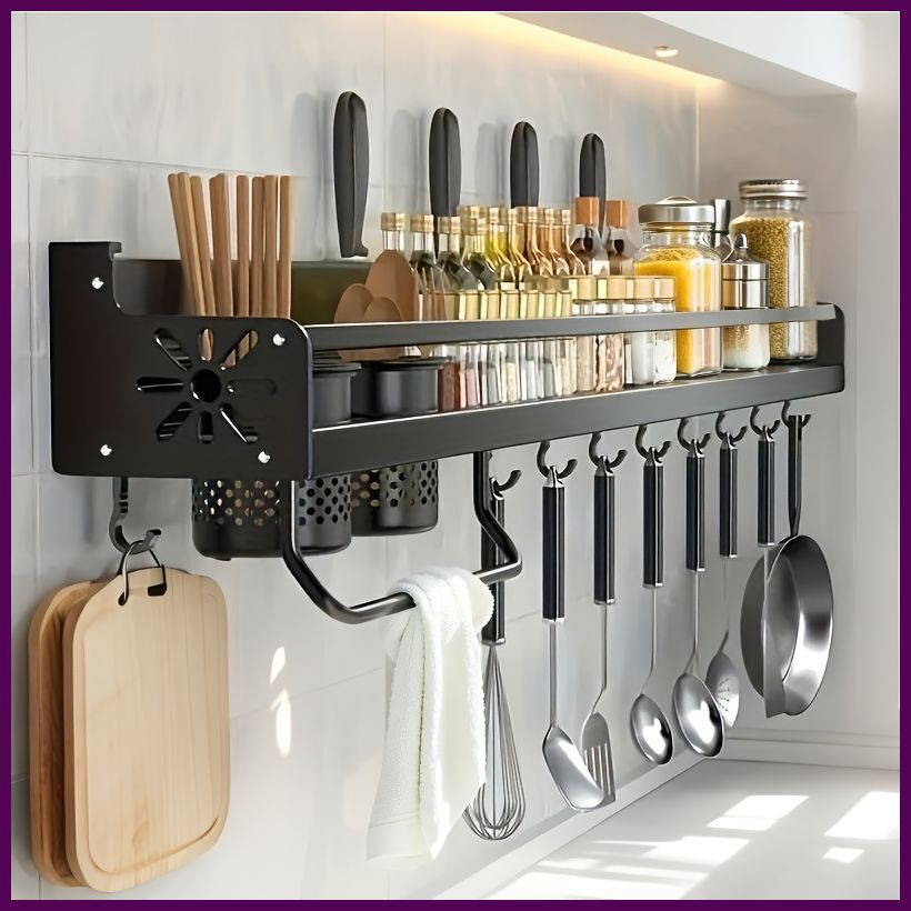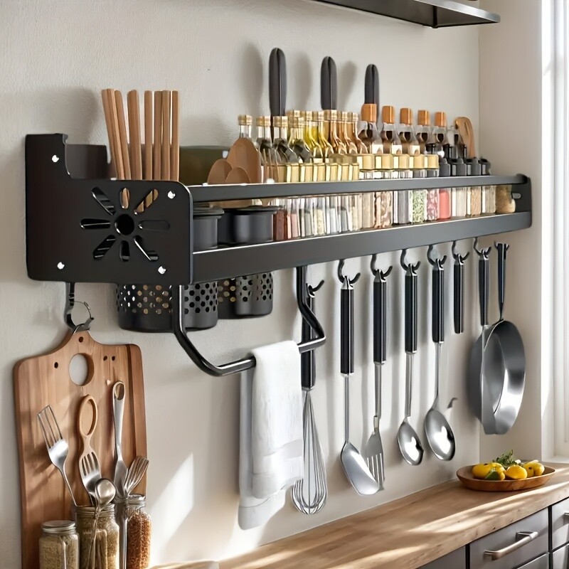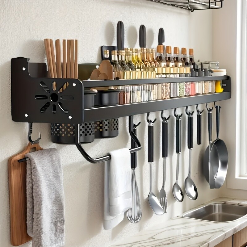 Upgrade your kitchen storage with this sleek metal hanging spice rack, designed to save space and keep your cooking essentials within easy reach. With a no-drill installation, this multi-purpose kitchen organizer features hooks for utensils and space for spice jars, knives, or chopsticks?perfect for modern homes, rentals, or anyone who loves a tidy kitchen.