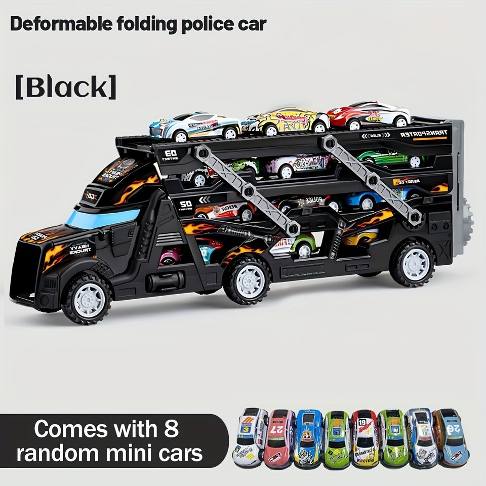 ? 9pcs Transformable Toy Truck Set ? Foldable Cargo Launcher + 8 Mini Alloy Cars (Black)