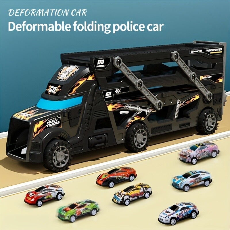 Unleash action-packed fun with this 9-in-1 Transformable Toy Truck Set, perfect for boys and girls aged 3 and up! Designed for interactive play and easy storage, the set includes a large black cargo truck that transforms into a foldable launcher and play station, plus 8 vibrant alloy mini cars for non-stop imaginative adventures.