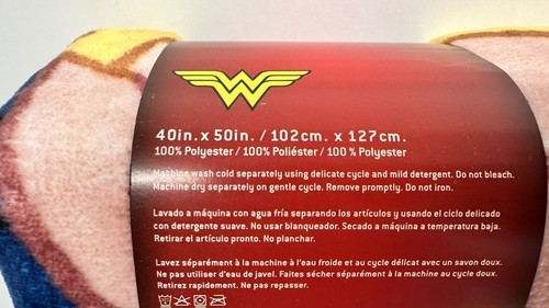 Get cozy with this silky soft 40in x 50in Wonder Woman DC Comics throw blanket. Featuring the iconic superheroine, this multicolor blanket is perfect for fans of all ages. Made from 100% polyester, this all-seasons throw is machine washable for easy care.