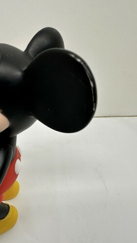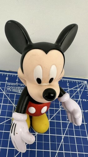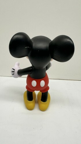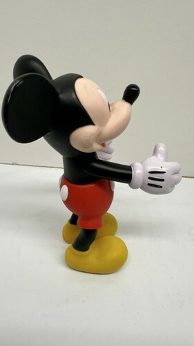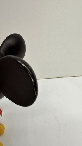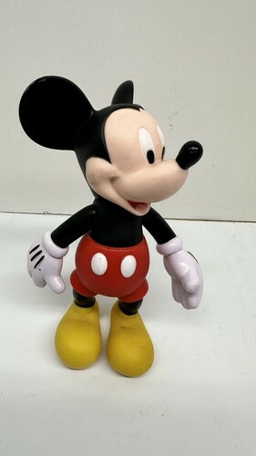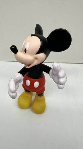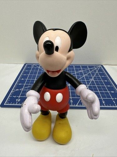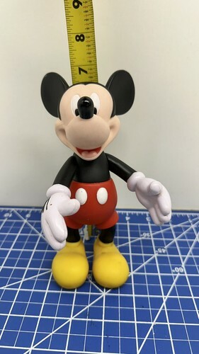 Has some wear spots on ears. The Disney Mickey Mouse Adjustable Toy Figurine Figure stands at 7 inches tall and is a part of the Disney brand and franchise. This collectible piece features the iconic character of Mickey Mouse, making it a must-have for Disneyana collectors and fans of the beloved cartoon mouse. The adjustable design adds a unique element to this figurine, allowing for customization in display. Perfect for fans of Disney and Mickey Mouse, this figurine captures the timeless charm and appeal of the character in a contemporary collectible piece.