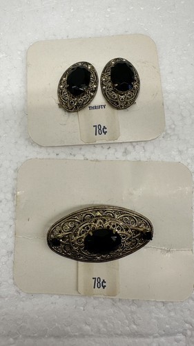 Thrifty Costume Jewelry Black Onyx FAKE Earrings & Brooch Vtg