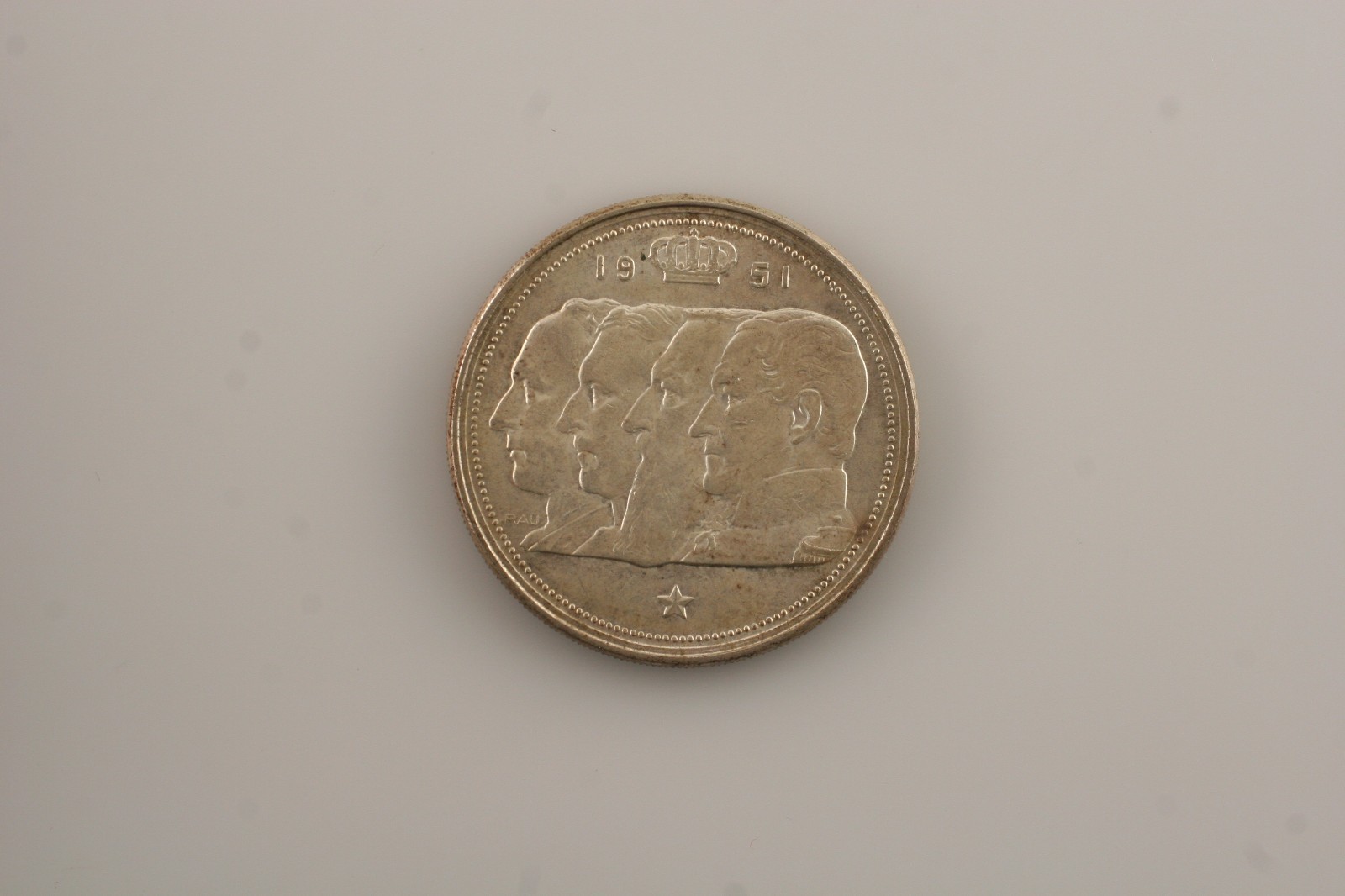 Contrarrestar: Cabezas unidas a la izquierda de Leopold I, Leopold II, Albert I y Leopold III, izquierda, Crown Divide Date en la parte superior, estrella en la parte inferior