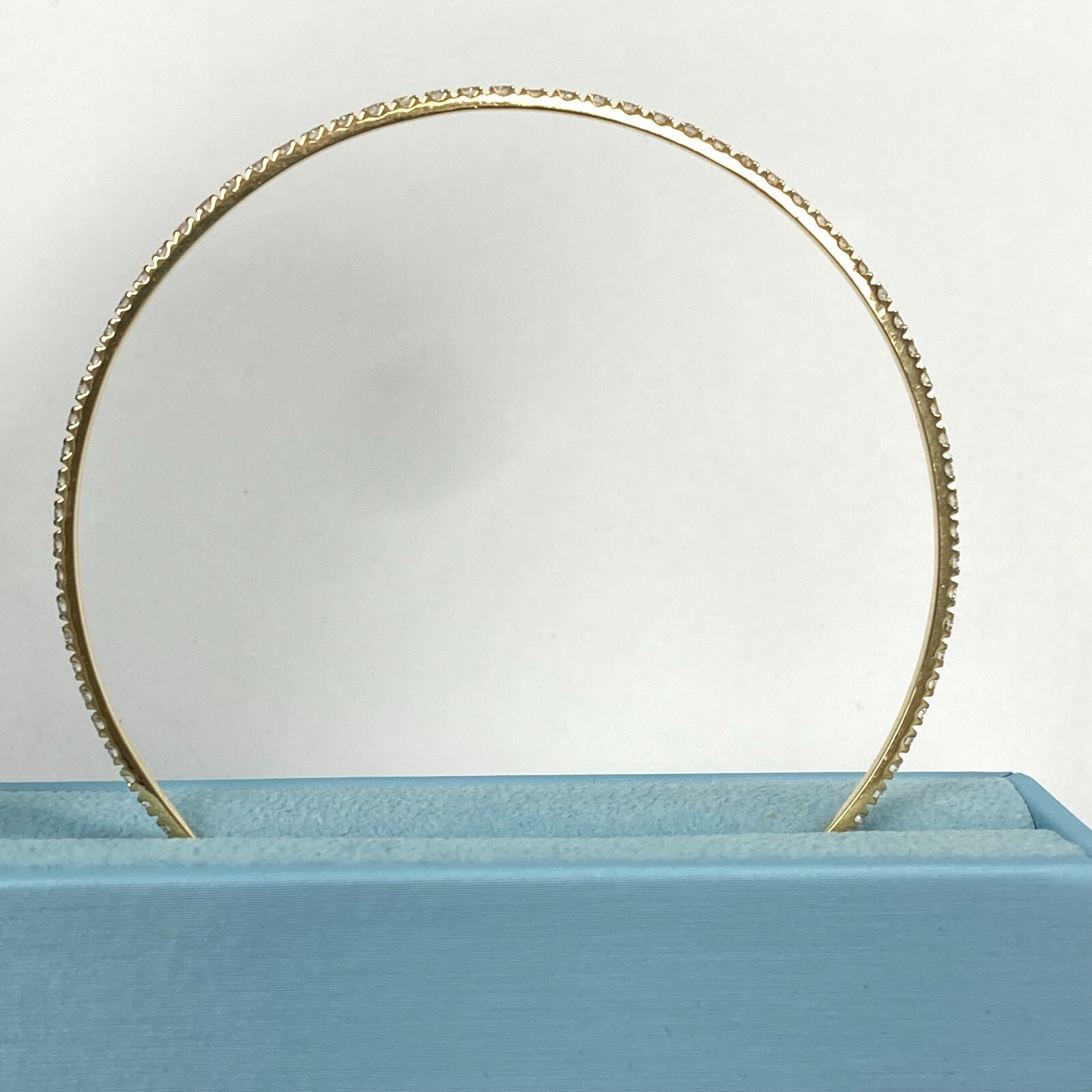 This exquisite piece features a 14k yellow gold setting adorned with a dazzling array of 1.75 carats of round brilliant-cut diamonds, meticulously placed in a pave setting. The brilliance of these diamonds extends all the way around the bangle, ensuring that every angle shimmers with unmatched beauty. Designed to fit a 7-inch wrist, the bangle has a diameter of 2 1/2 inches and 2 mm width.