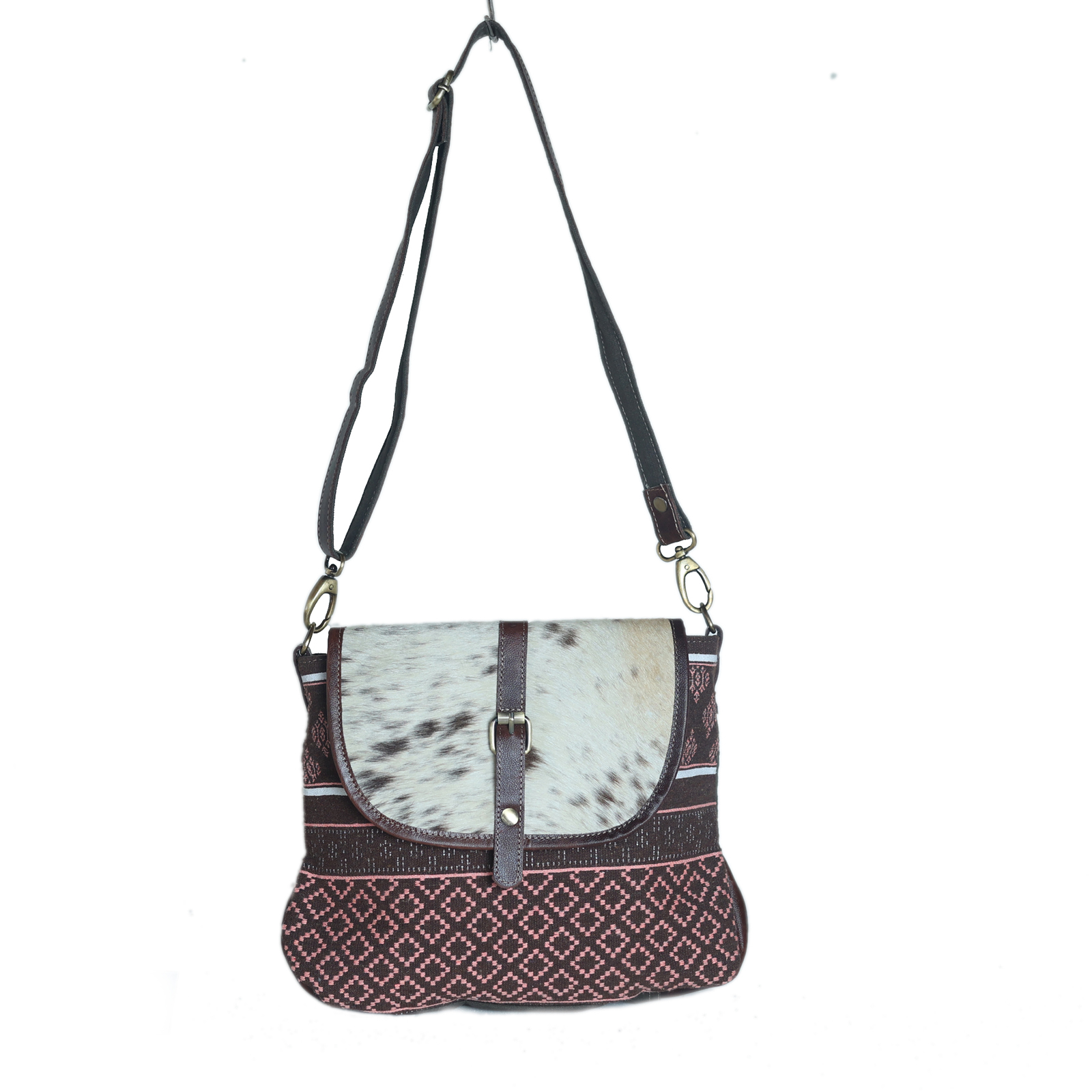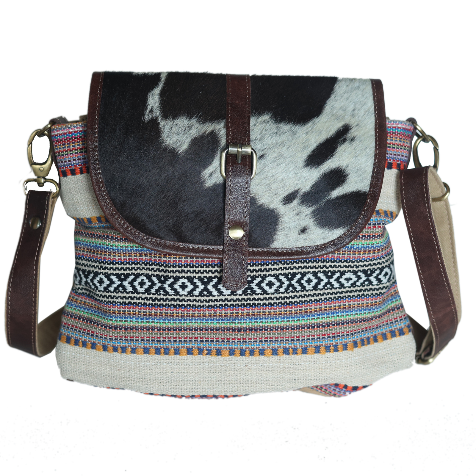 Challenger women's handbag made from upcycled canvas and full-grain leather. Shoulder bag is uniquely accented with a beautiful multicolored design. This practical, lightweight, and conveniently sized roomy bag is made sturdy to endure everyday use. Perfect choice for school, work, travel, or weekend trips. Main compartment has a full zipper closure with a wide opening to easily access your belongings. The fully lined interior also features a side zippered pocket, and two open pockets for additional storage. The backside also has a zippered pocket to store easily reachable items. The antique finish brass hardware beautifully ties the bag together. Bag measures 12.5" L x 9.5" H providing plenty of room for all of your everyday essentials.