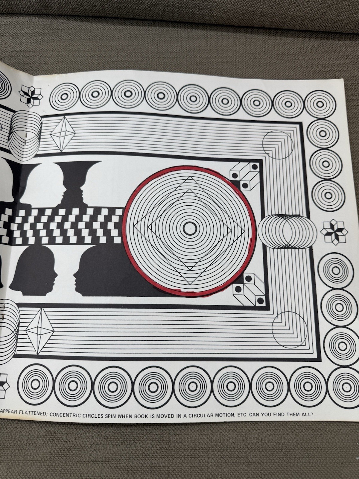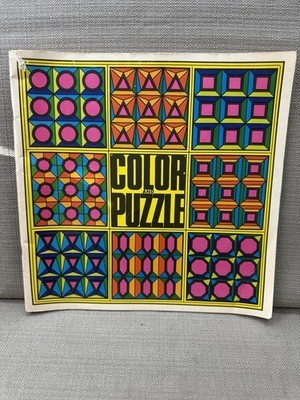 Measures 12? x 12?. Two pages have been lightly colored, with some bleed-through visible on the reverse, but no puzzles have been completed. Overall great vintage condition with vibrant covers and clean pages. A fantastic collectible for fans of vintage design, retro puzzles, or optical art books.