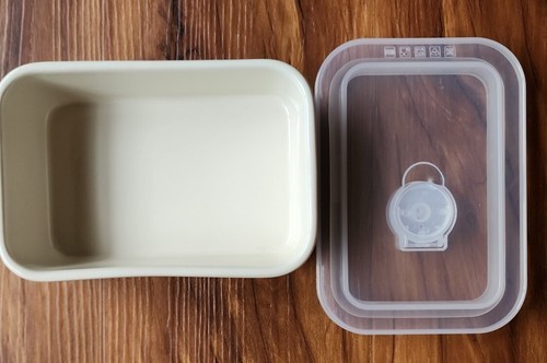 Rectangular shaped ~ measures approximately 5.75" wide x 4" deep x 2" tall (without lid)
