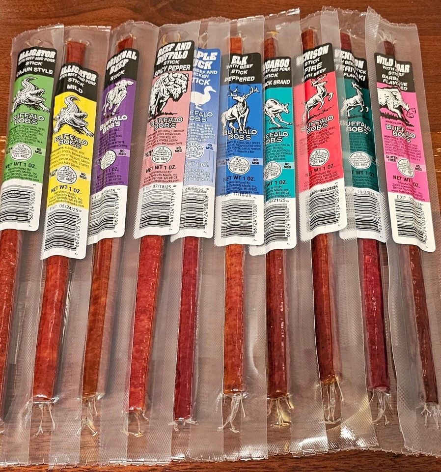 Alligator Cajun, Alligator Mild, Original Beef, Buffalo Spicy Peppered, Duck Maple, Elk Peppered, Kangaroo, Venison Fire, Venison Teriyaki, Wild Boar BBQ