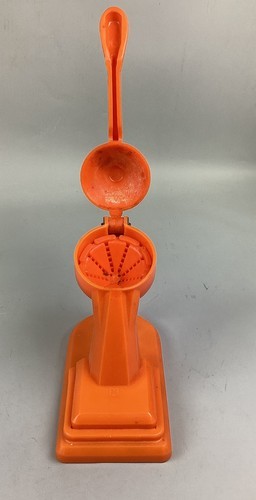 This is a vintage bright orange manual juicer for oranges and is large enough to fit a grapefruit. The interior area comes out for easy cleaning. Product is made from a hard plastic. In used condition. Being sold as is. Please take a look at the pictures to see the condition of the item.
