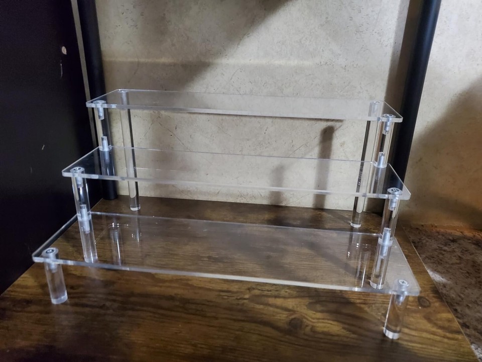 ? Size ? Each acrylic panel is 11.6 inches long, 3.0 inches wide, with a layer height of 1.9 inches and a total height of 5.7 inches. The shelf risers design is simple, durable, and can accommodate items of different weights and sizes. The risers for display has three layers, providing enough space for perfume stand, figures, cosmetics, desserts, cupcake risers, collectibles, etc.