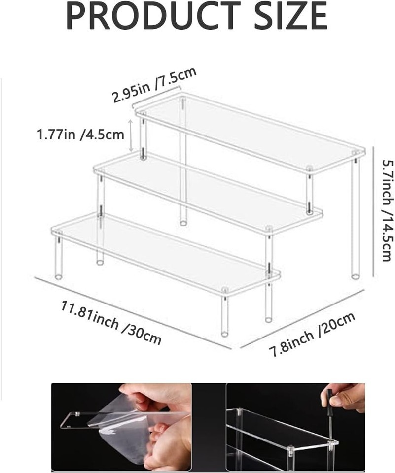 ?Exquisite Design?Acrylic display stand made of delicate acrylic, transparent design, subtle lines make up the modern design support legs of this acrylic riser display strong enough, and double headed screws and countersunk hole technology make the connection more beautiful.whole display shelf size:11.81x 8.1 x 5.6inches, so ours can display more items than others.