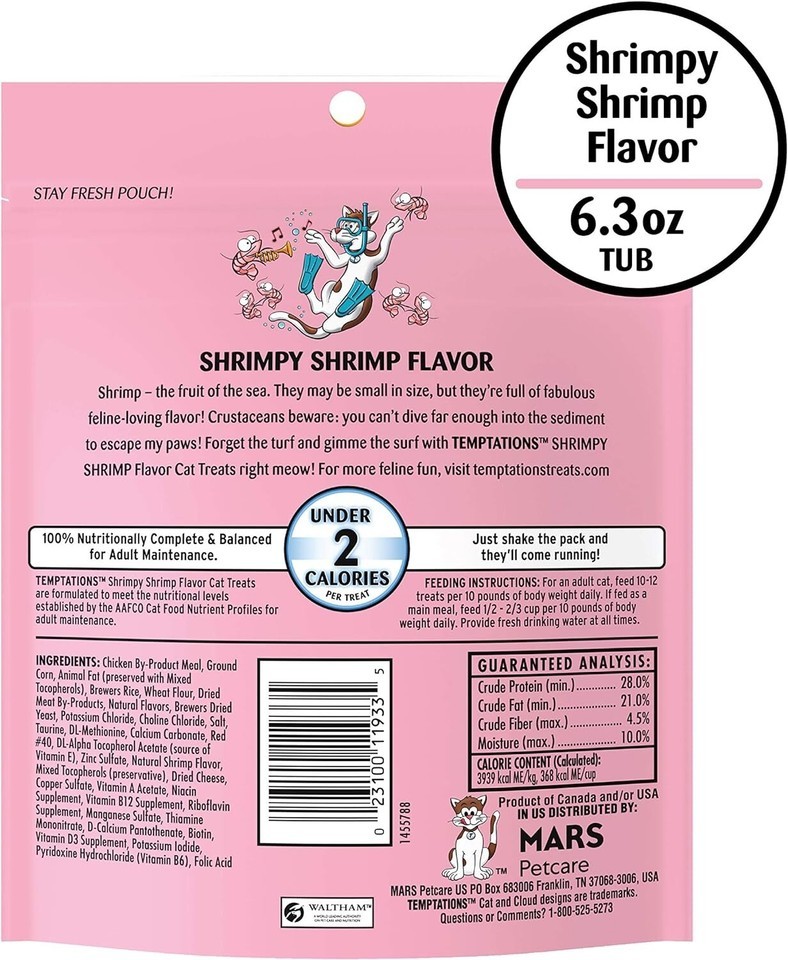 Contains one (1) 6.3 oz. pouch of TEMPTATIONS Classic Cat Treats Shrimpy Shrimp Flavor