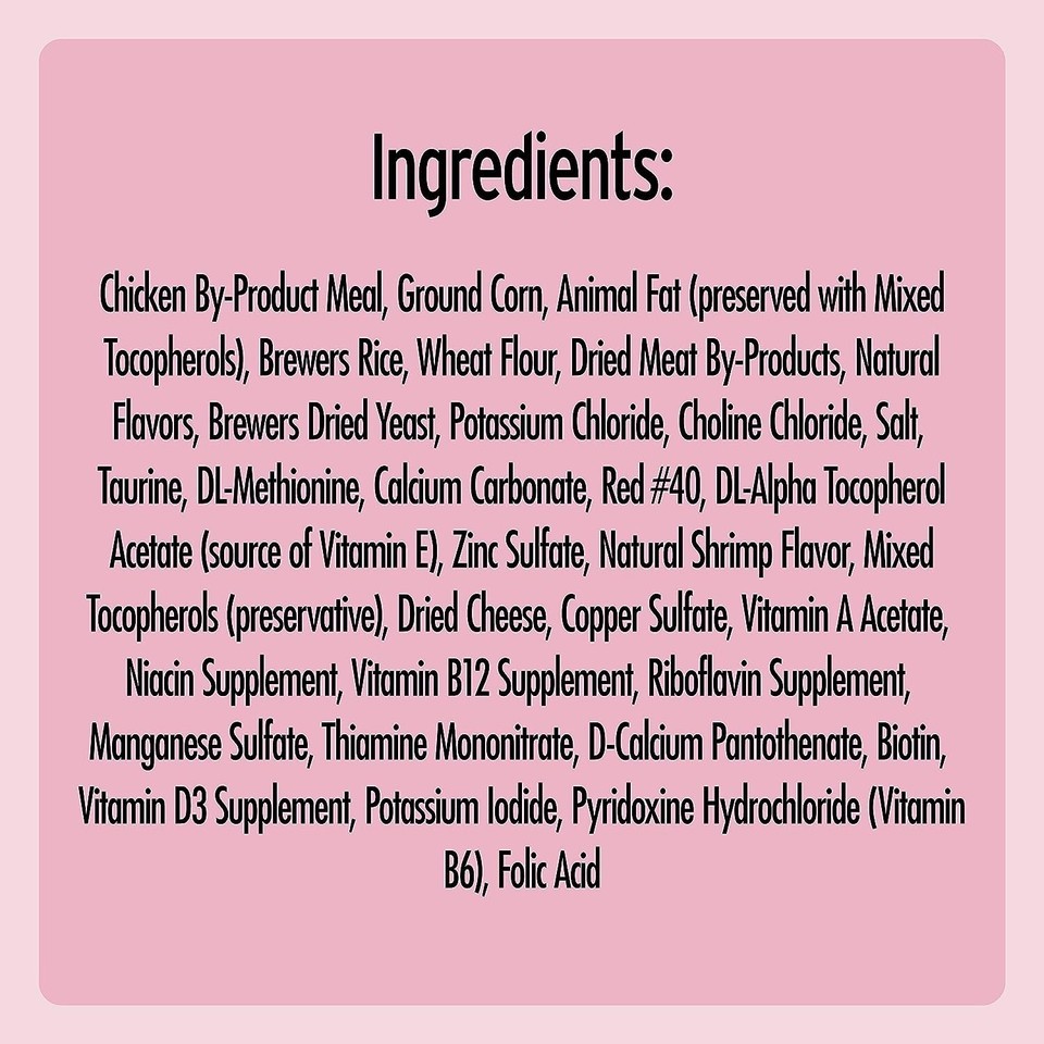 Chicken By-Product Meal, Ground Corn, Animal Fat (Preserved with Mixed Tocopherols), Dried Meat By-Products, Brewers Rice, Wheat Flour, Natural Flavors, Grain Distillers Dried Yeast, Potassium Chloride, Choline Chloride, Salt, Taurine, DL-Methionine, Calcium Carbonate, Red #40, Vitamins (dl-Alpha Tocopherol Acetate [Source of Vitamin E], Vitamin A Acetate, Niacin Supplement, Vitamin B12 Supplement, Riboflavin Supplement, Thiamine Mononitrate, d-Calcium Pantothenate, Biotin Supplement, Vitamin D3 Supplement, Pyridoxine Hydrochloride [Vitamin B6], Folic Acid Supplement), Minerals (Zinc Sulfate, Copper Sulfate, Manganese Sulfate, Potassium Iodide), Natural Shrimp Flavor, Mixed Tocopherols (Natural Preservative), Dried Cheese