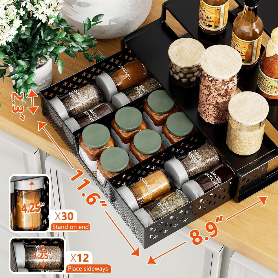 ?Stepped Design?Our spice rack has a stepped design to make it easier to find the herbs and seasonings .Each step is 3.1" deep that fits most spice jars. One-piece molded design ready to use without installation.