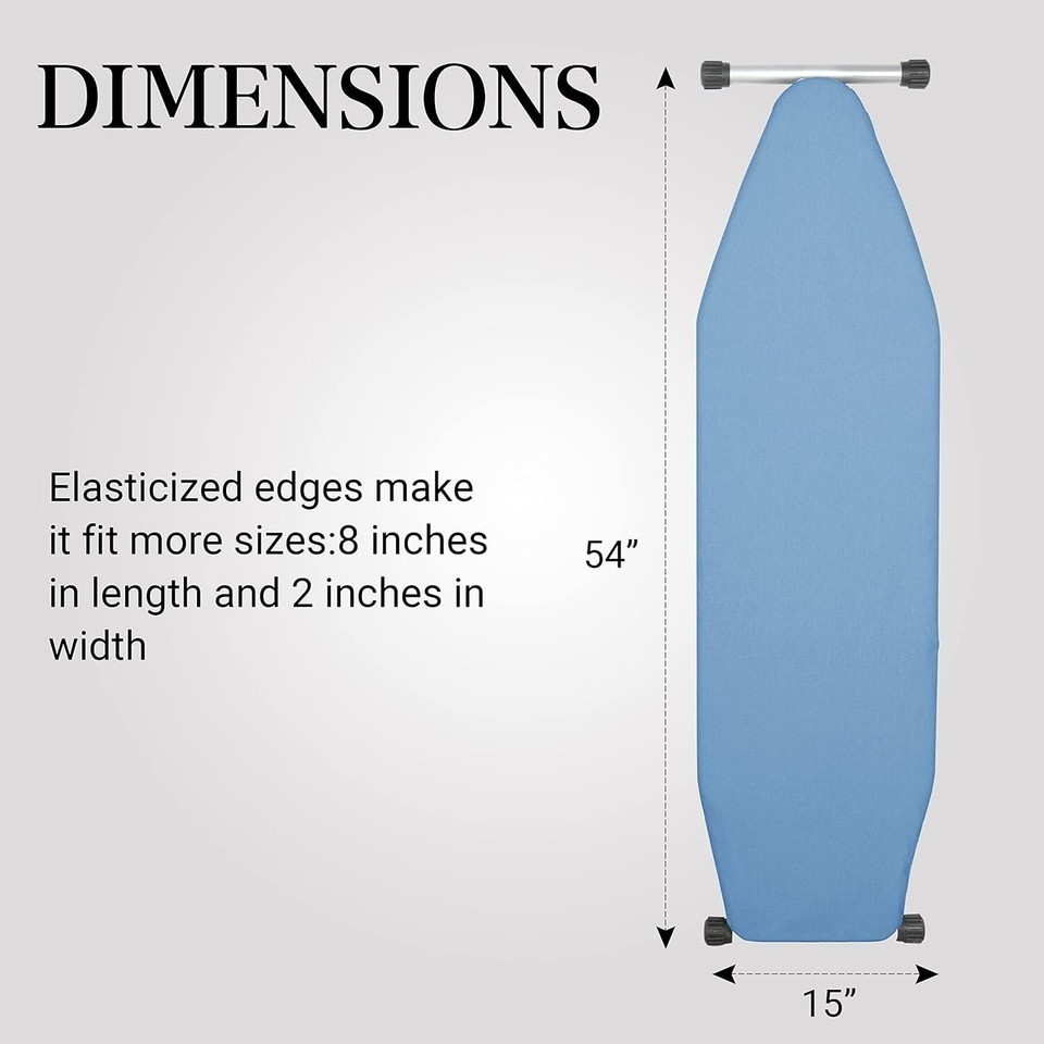 ?SIZE?:ZOES HOMEWARE 15"x54" full size ironing board cover and pad is designed to fit full size ironing boards. The design of elastic edges allows it to fit ironing boards with lengths ranging from 50 to 56 inches and widths ranging from 13 to 17 inches. It's also quilted for extra protection and durability - no more wrinkled, scorched, or torn ironing board covers.Best for steam generator irons