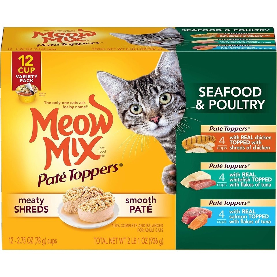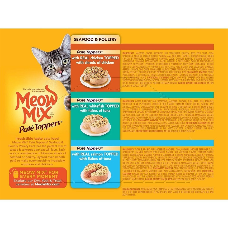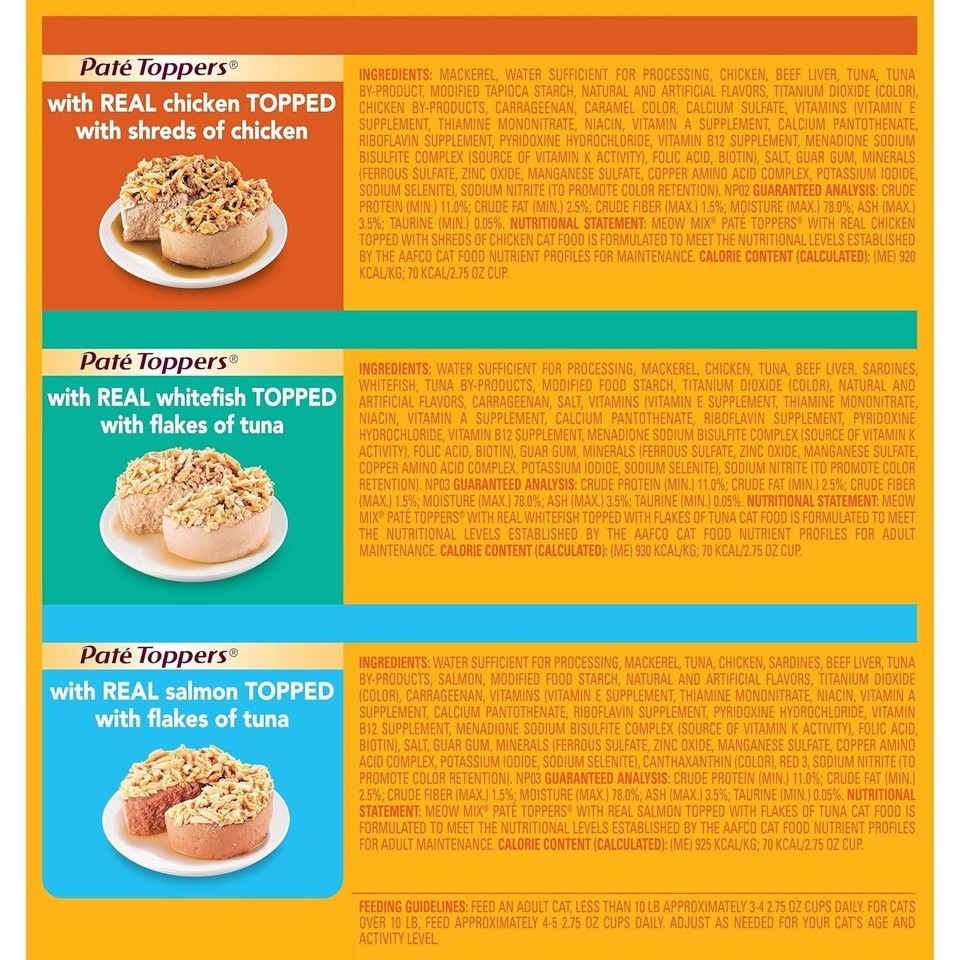 Previously known as Meow Mix Pate Toppers, each variety features a smooth pate cat food made with real whitefish, chicken or salmon and TOPPED with shreds of chicken or tuna ? irresistibly nutritious and delicious