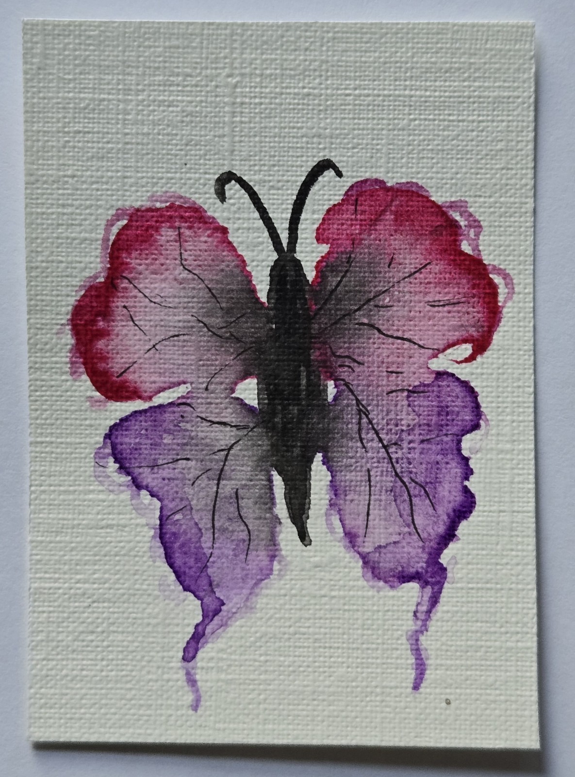 A delicate and expressive miniature butterfly painting blending soft purple and red hues, perfect for collectors of nature-inspired mini art.