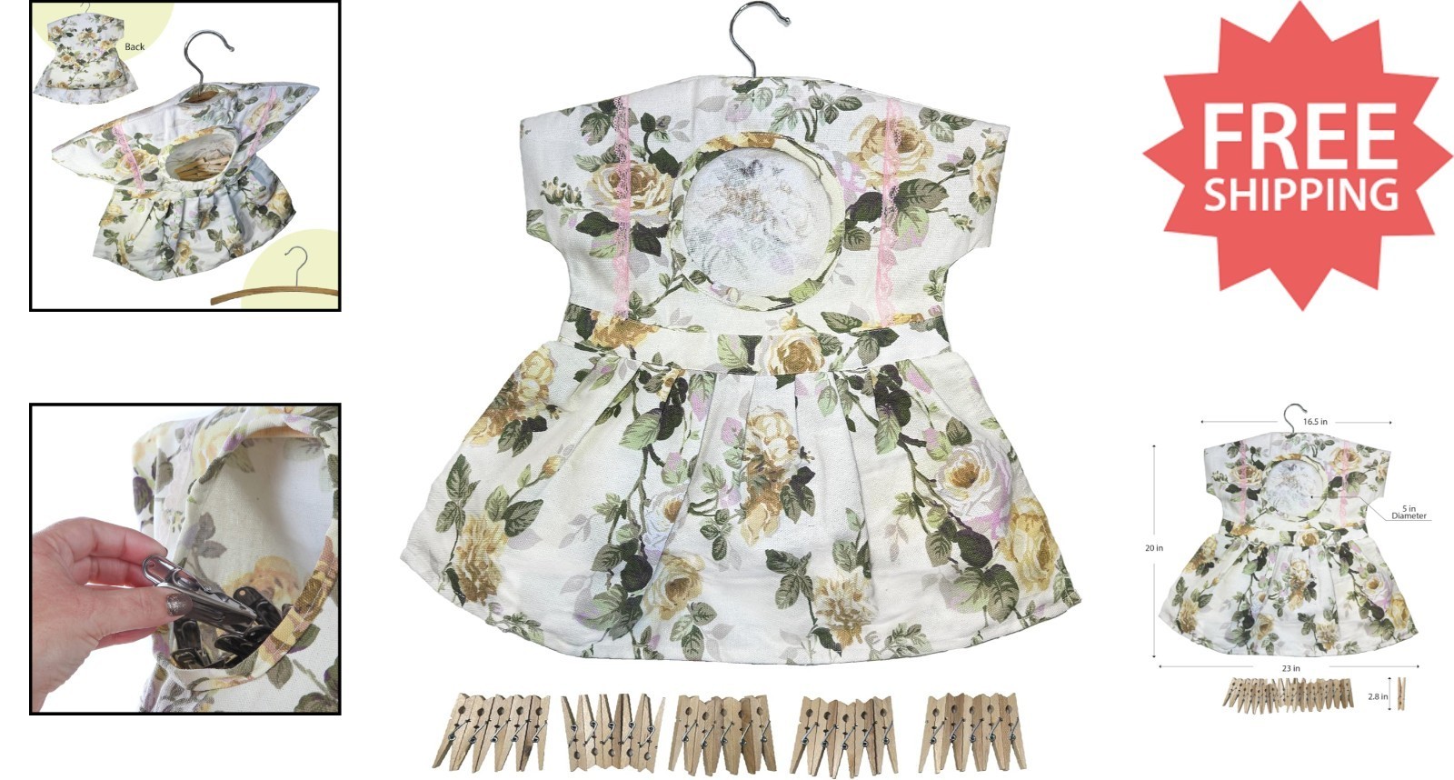 Features: Portable,Attached Wooden Hanger,Easy Maintenance,Charming Design,Floral-print dress,Pink lace trim,Practical Storage,Includes 25 wooden clothespins,Sturdy wooden hanger,Effortless hanging,Space-saving design,Keeps clothespins within,Gentle on clothes,Long-lasting performance,Durable construction,Spot clean maintenance