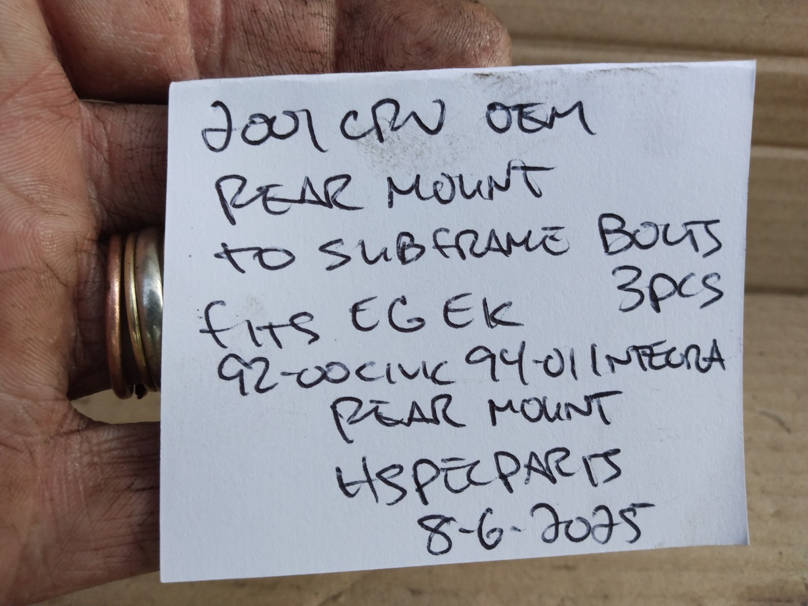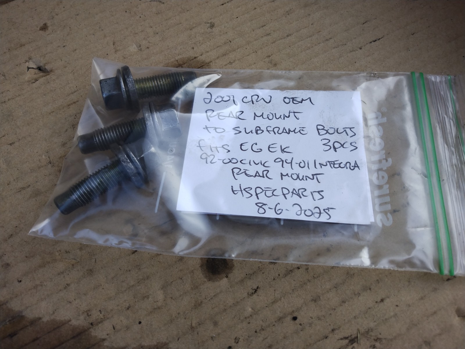 GOOD USED CONDITION. REAR MOTOR MOUNT TO SUBFRAME BOLTS. OEM 3PCS - 14MM HEAD. FROM A 2001 CRV. FITS INTEGRA,092-00 CIVIC AND 97-01 CRV. SHIPS USPS WITHIN A BUSINESS DAY OF PAYMENT.