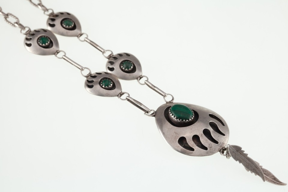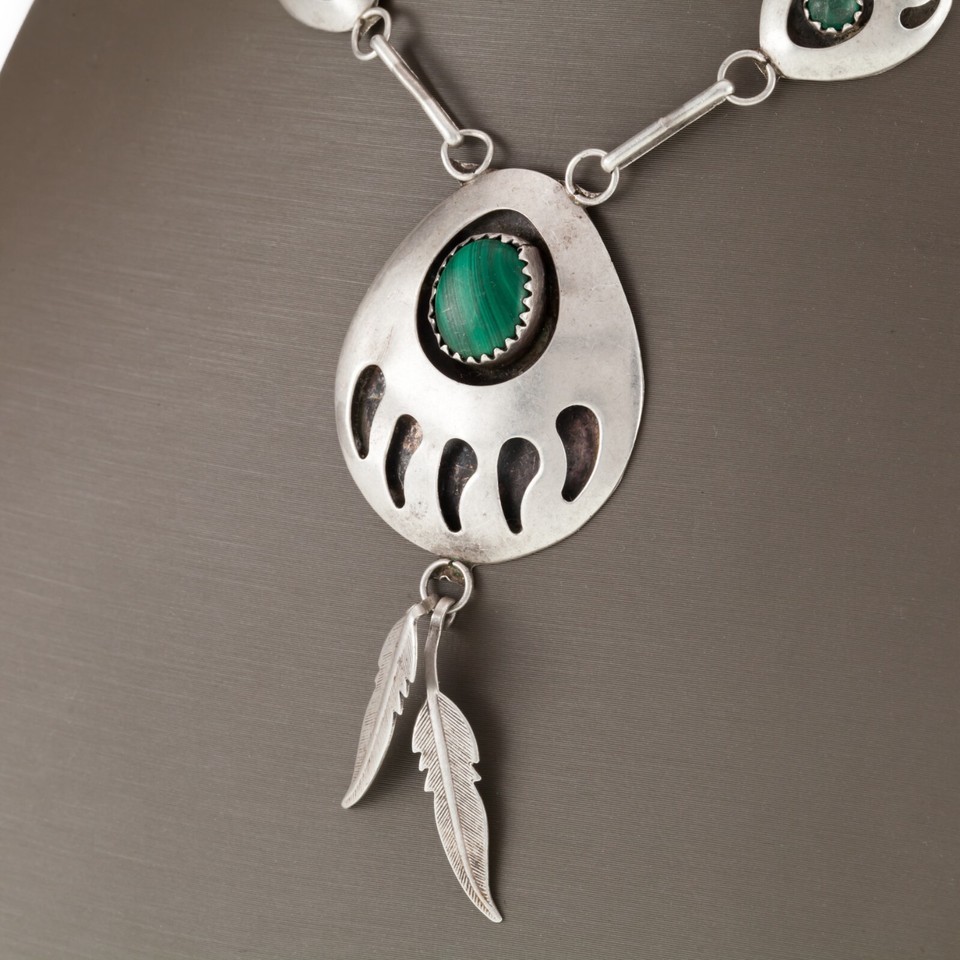 Navajo Sterling Silver Malachite Bear Paw Necklace with Feathers, 27" 24.4g- ...