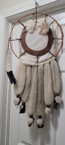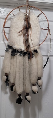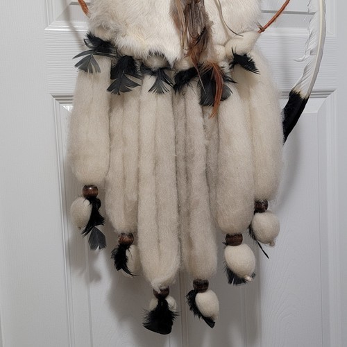 Vintage Native American Handmade Mandella Southwest Dream Catcher - Made of Rabbit Fur / Feathers / Beads / Wool. Approximately 30?x14?
