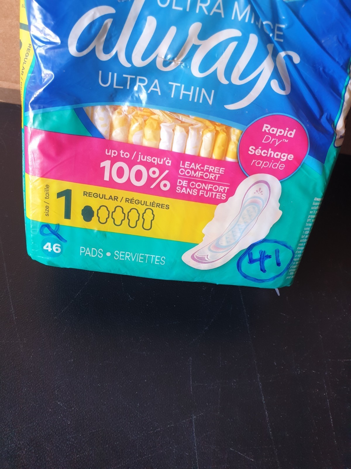 Always Ultra Thin Pad Size 1 Regular Absorbency Rapid Dry Leak Free Comfort 41Ct.