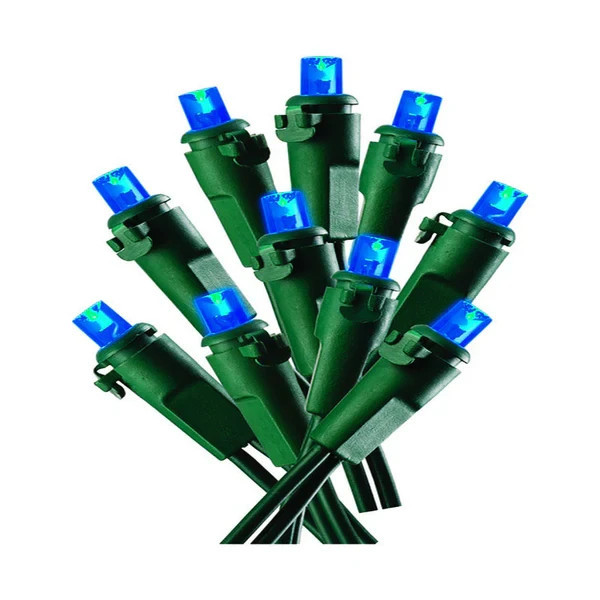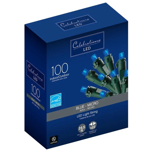 The Celebrations 47982-71 Blue LED Micro Light Set features 100 energy-efficient blue LED bulbs spaced evenly along a 24.75-inch lighted length, delivering consistent, cool-burning illumination for delicate holiday accents. Designed for both indoor and outdoor use, this compact string uses a green wire to blend naturally with garlands, wreaths, and small trees. Powered by a standard 120V plug-in outlet and drawing only 9.6 watts, it offers safe, low-heat operation while remaining Energy Star certified for efficiency. The constant (non-flashing) light output provides a serene, uniform glow ideal for subtle decorative layering or standalone mini displays.
