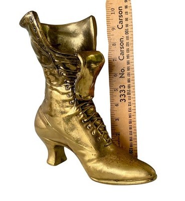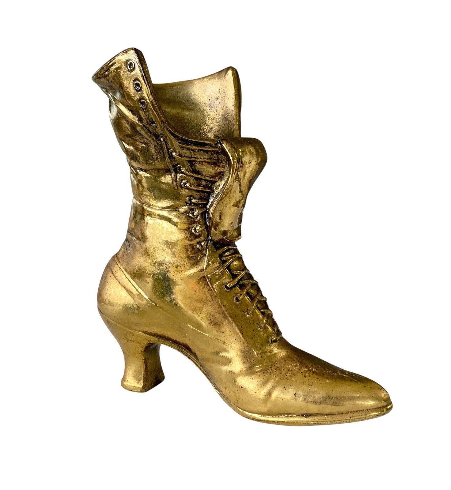 Vintage Brass Cast Metal Victorian Ladies Boot Vase Doorstop Weathered 10” Tall